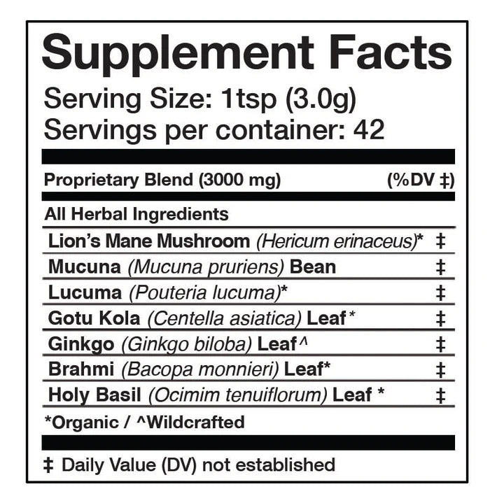 INGREDIENTS: Lions Mane*, Mucuna Bean, Lucuma*, Gotu Kola Leaf*, Ginkgo Leaf^, Brahmi Leaf*, Holy Basil Leaf*