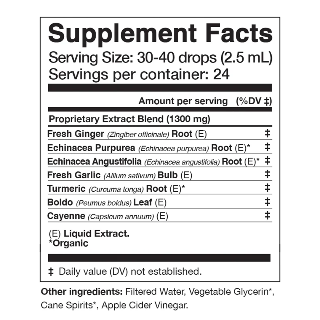 INGREDIENTS: Fresh Ginger Root (Zingiber officinale) (E)*, Echinacea Purpurea Root (Echinacea purpurea) (E)*, Echinacea Angustifolia Root (Echinacea angustifolia) (E)*, Fresh Garlic Bulb (Allum sativum) (E)*, Turmeric Root (Curcuma longa) (E)*, Boldo Leaf (Peumus boldus) (E)*, Cayenne Pepper (Capsicum annuum) (E)*