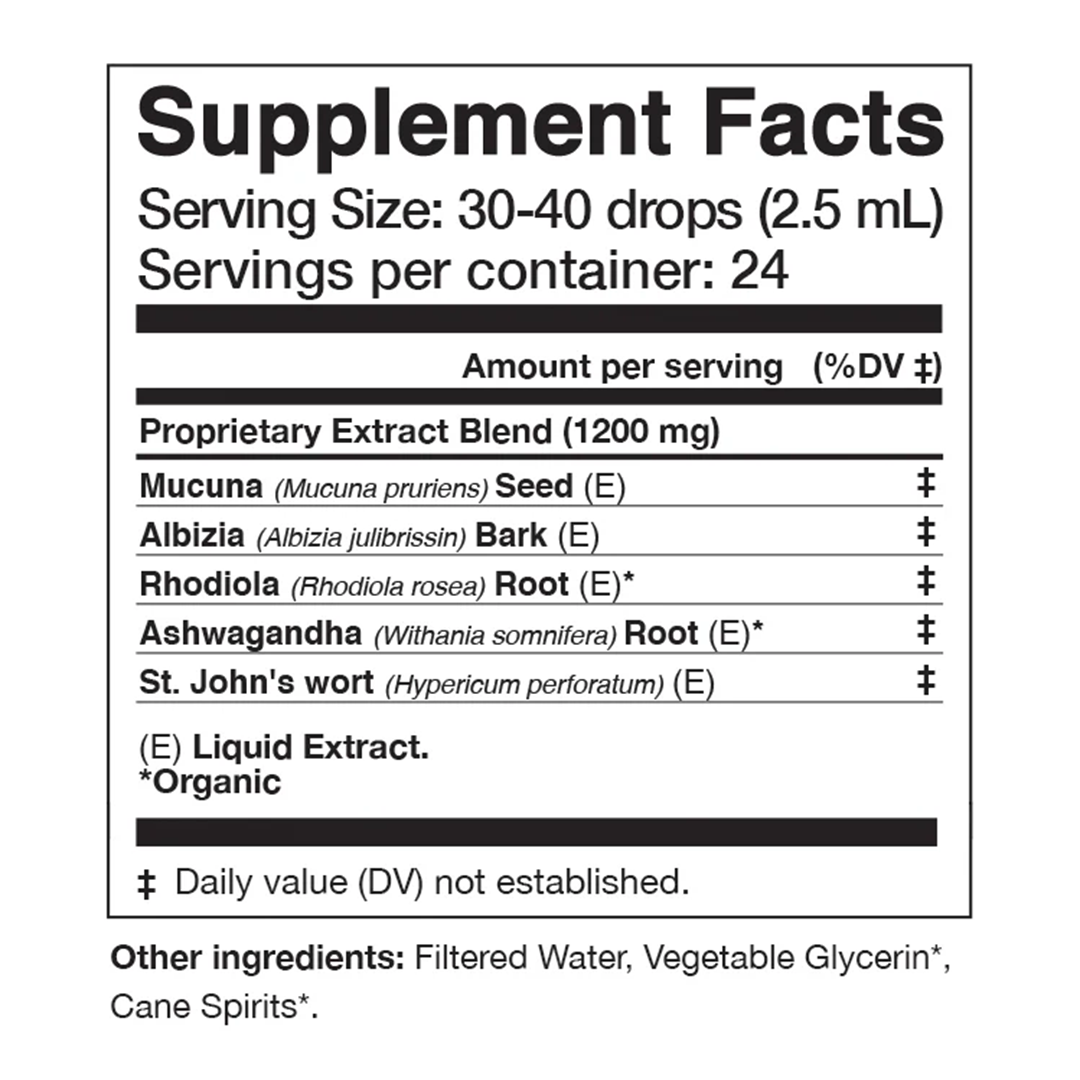 INGREDIENTS: Mucuna Seed (Mucuna pruriens) (E), Albizia Bark (Albizia julibrissin) (E), Rhodiola Root (Rhodiola rosea) (E)*, Ashwagandha Root (Withania Somnifera) (E)*, St. John's Wort Leaf (Hypericum perforatum) (E)*