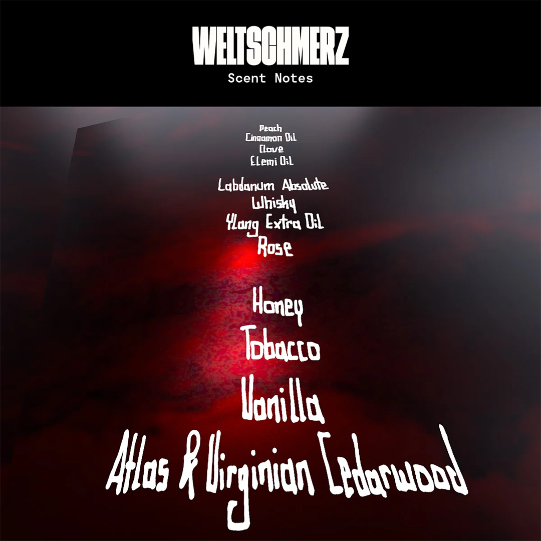 Peach, Cinnamon Oil, Clove, Elemi Oil, Labdanum Absolute, Whiskey, Ylang-Extra Oil, Rose, Honey, Tobacco, Vanilla, Atlas and Virginia Cedar Wood