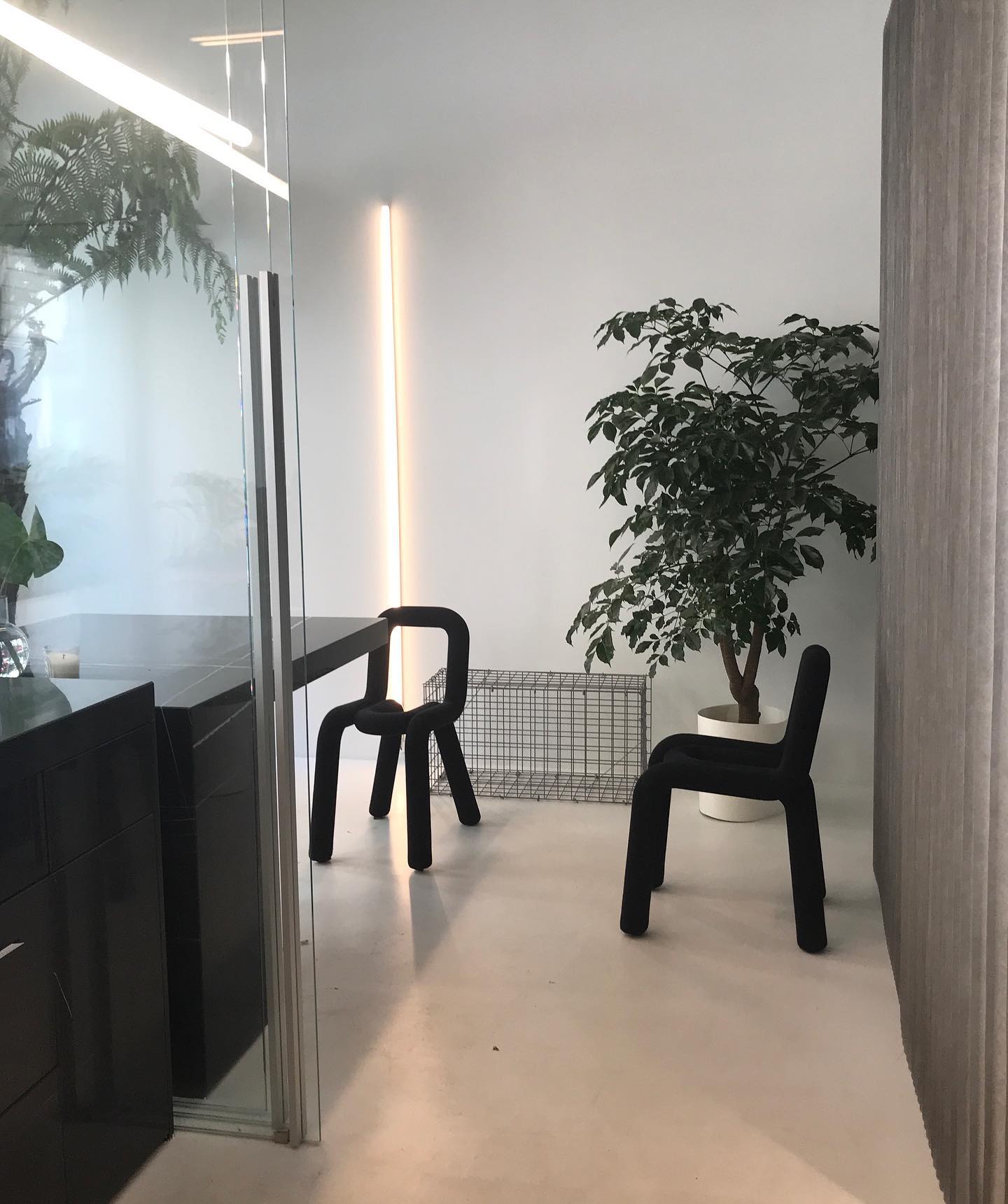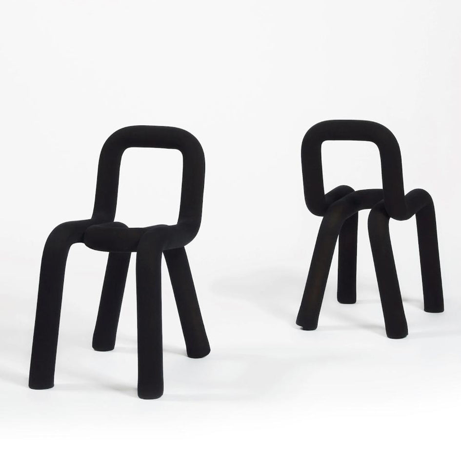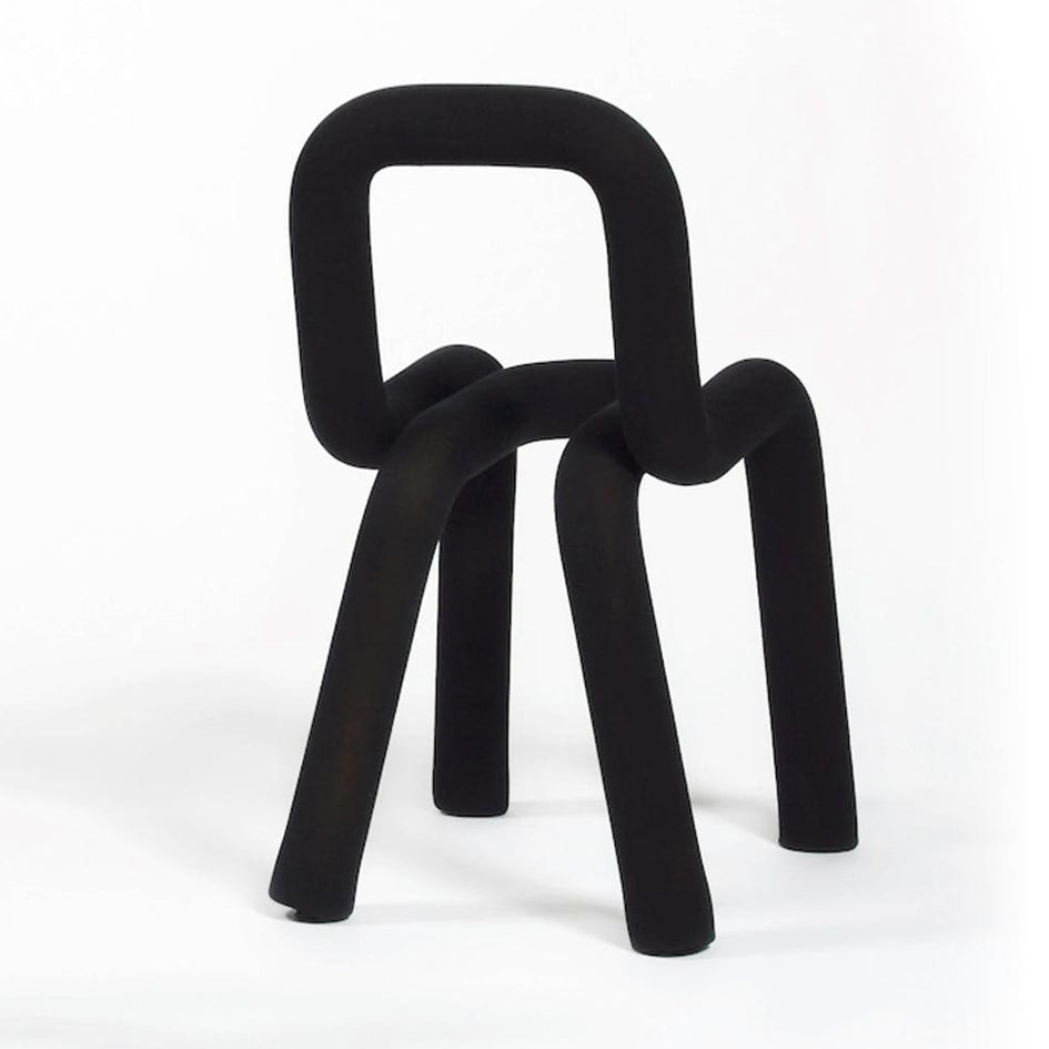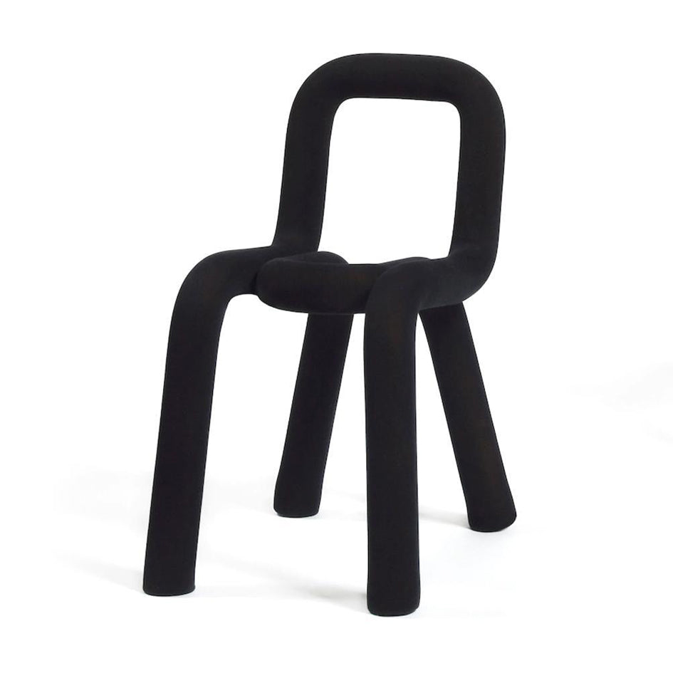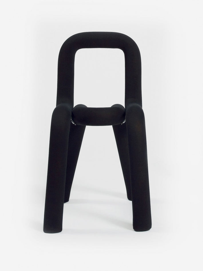 Made up of two tubular parts in metal embedded in each other, the Bold chair is an updated version of the tradition of a bended chair in tubular steel. Inflated with a thin polyurethane foam, the line drawn by the Bold successfully plays the role of foot, seat then back and gives it an amazing level of comfort. With a single stroke, in the manner of the Osvaldo Cavandoli Linea, and thickened similarly to the font which is made bold, the Bold chair succeeds in doing away with the seat and back. Covered with a removable textile coating, the Bold chair can change colour.