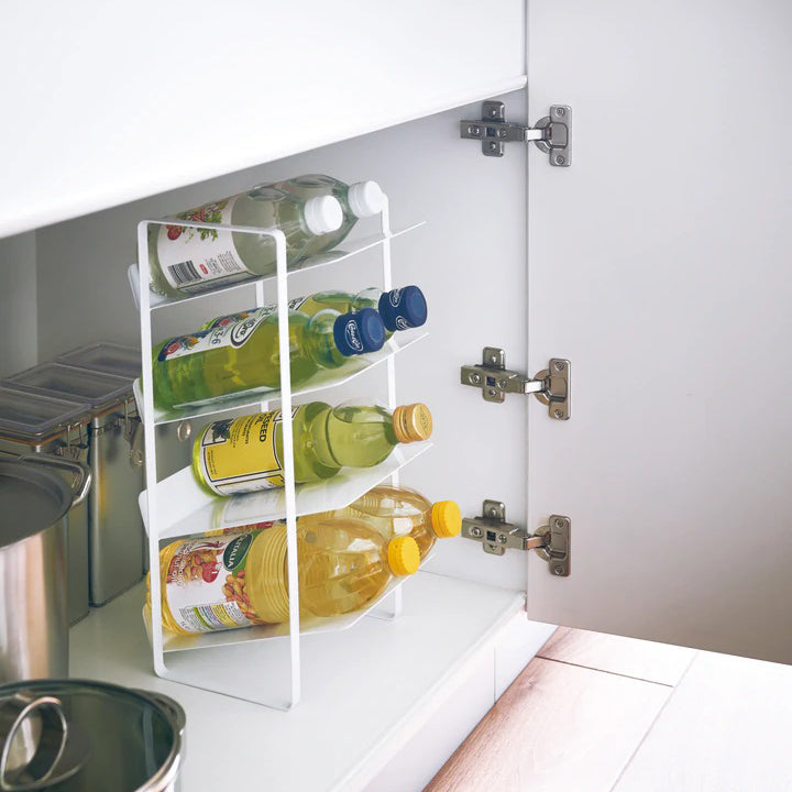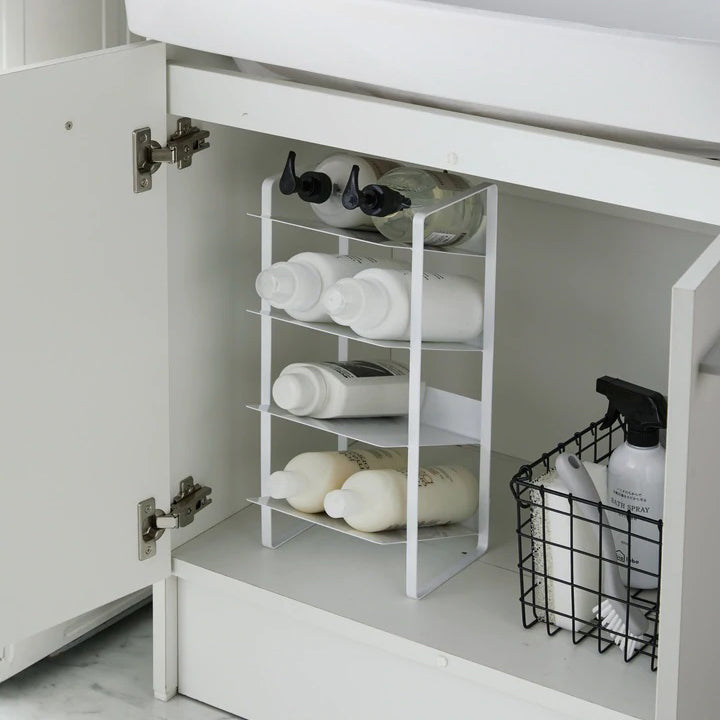 4 tiers that can stock a wide range of bottles such as PET bottles, shampoos or cleaning and detergent bottles. Because of its oblique position, grabbing the bottles comes easily.