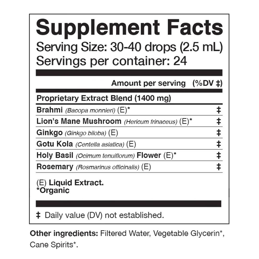 INGREDIENTS: Brahmi*, Lion's Mane Mushroom*, Ginkgo Leaf, Gotu Kola, Holy Basil*, Rosemary. Extracted in Cane Spirits* and Vegetable Glycerin.