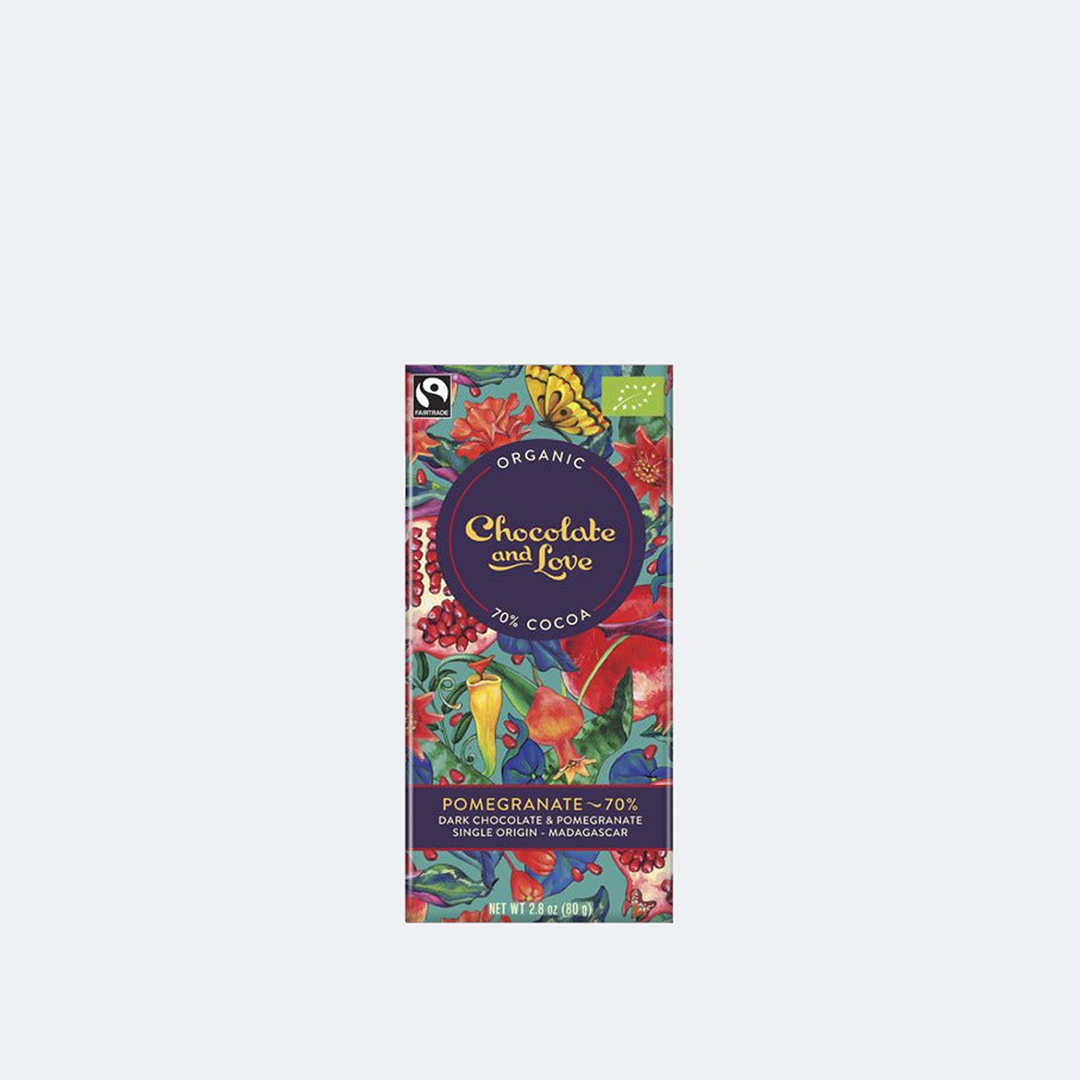 INGREDIENTS: Cocoa mass*, cane sugar*, cocoa butter* pomegranate preparation* 9% (pomegranate*, apple juice concentrate*, rice flour*, thickener* [pectin*]), vanilla pods*. *Certified organic. Cocoa, sugar, vanilla: traded in compliance with Fairtrade Standards, total 91%. Cocoa: 70% minimum.