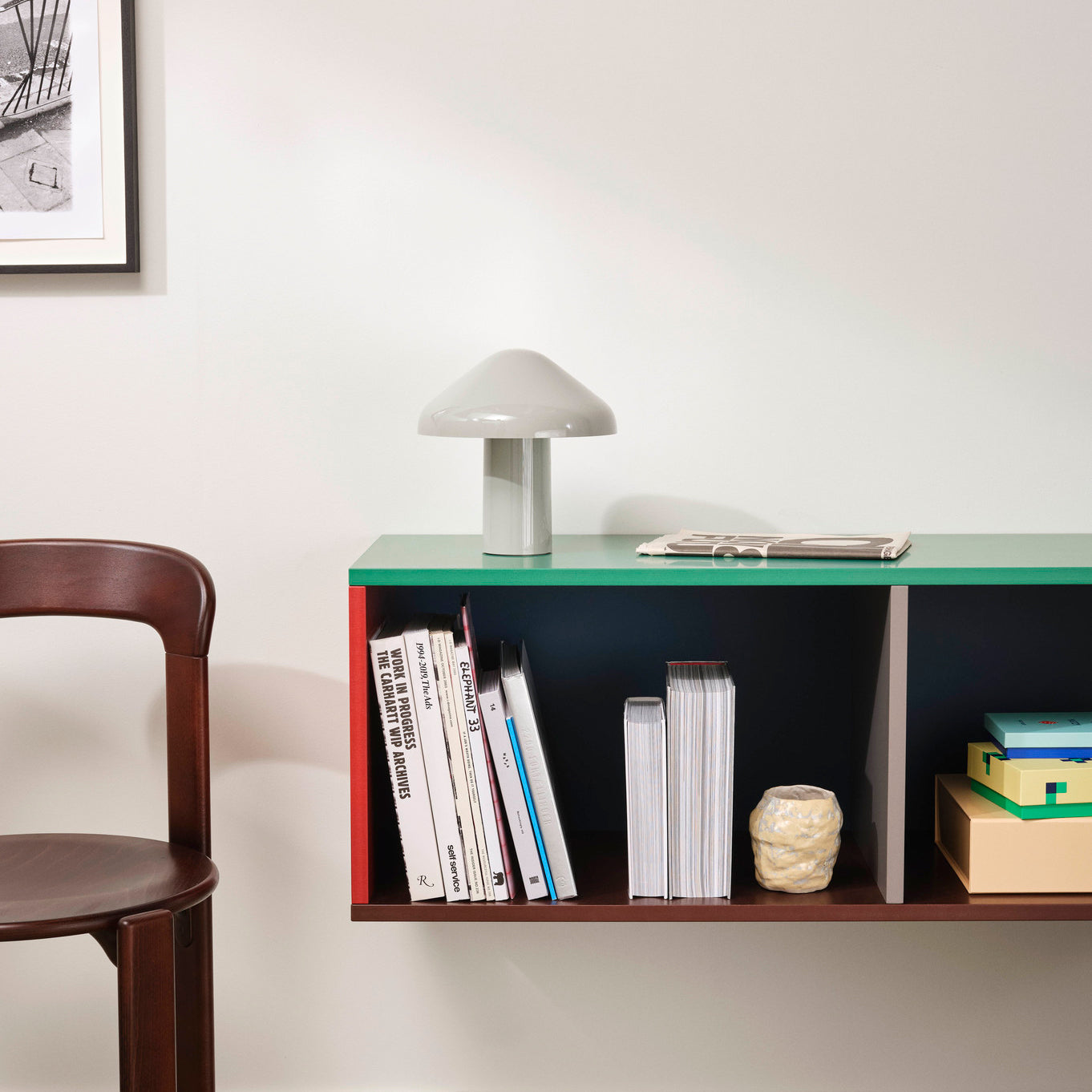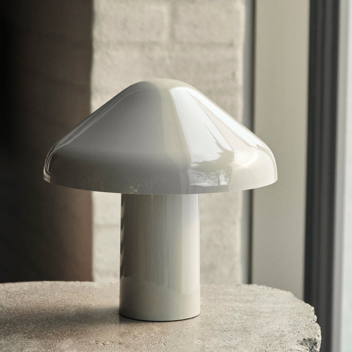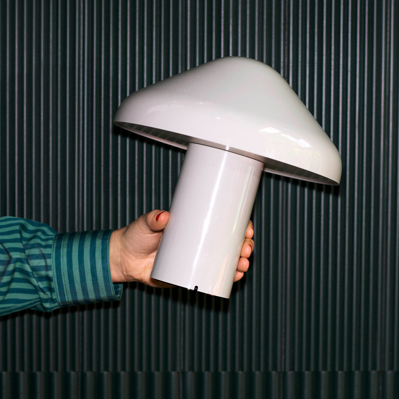 Both the lamp’s base and shade are constructed from a resistant polycarbonate, with a smooth, high gloss finish. The lamp’s light source is concealed inside the shade, behind an opal polycarbonate diffuser, providing an efficient diffused downlight, with a warm, homely glow. The compact, battery-operated design enables the lamp to be moved to different rooms around the house, or taken into the garden and other outside spaces.