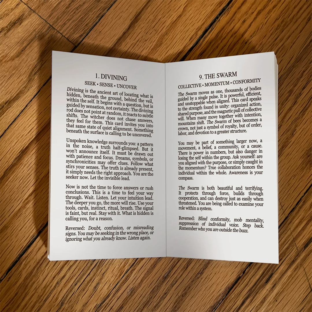 - 54 oracle cards, 7 mini playing cards, 2 add cards