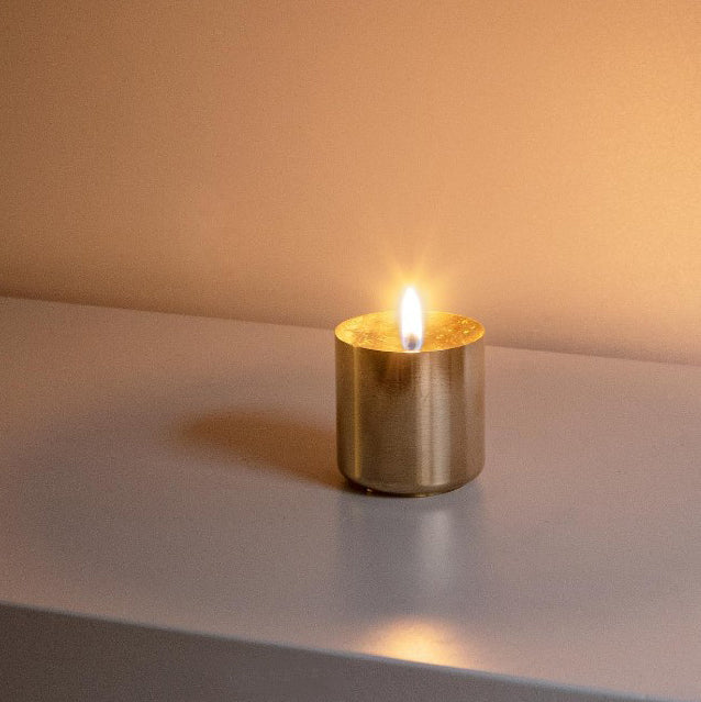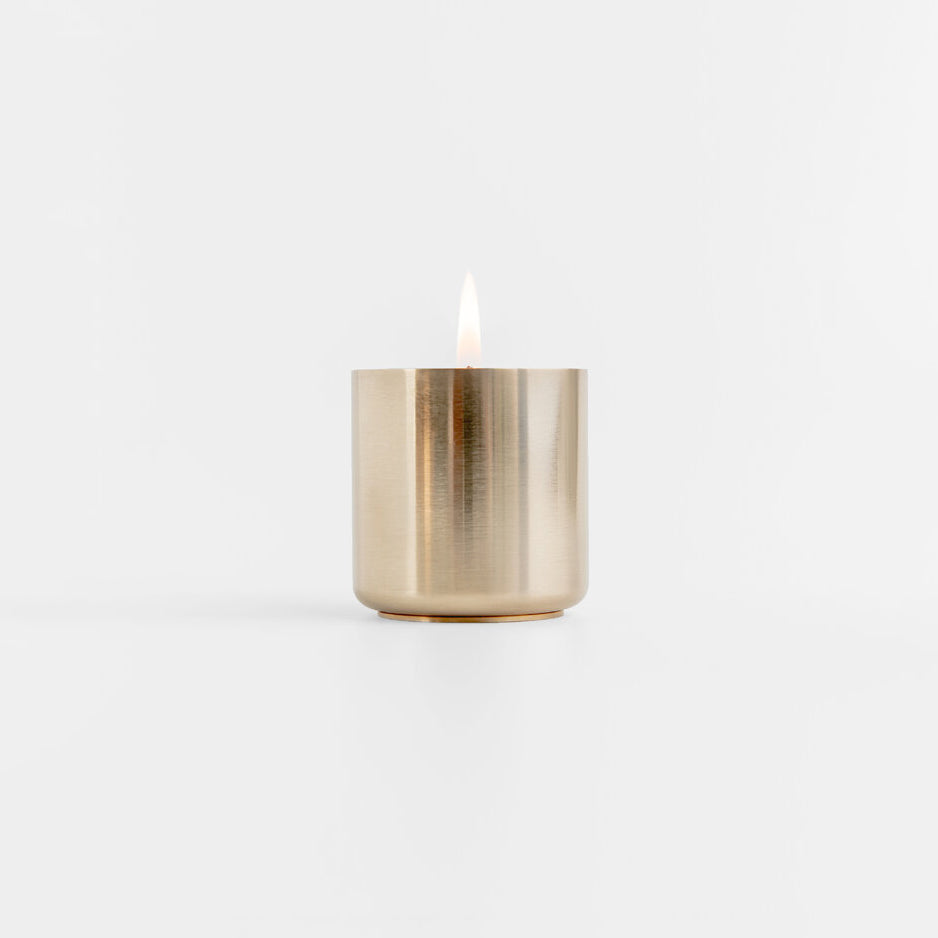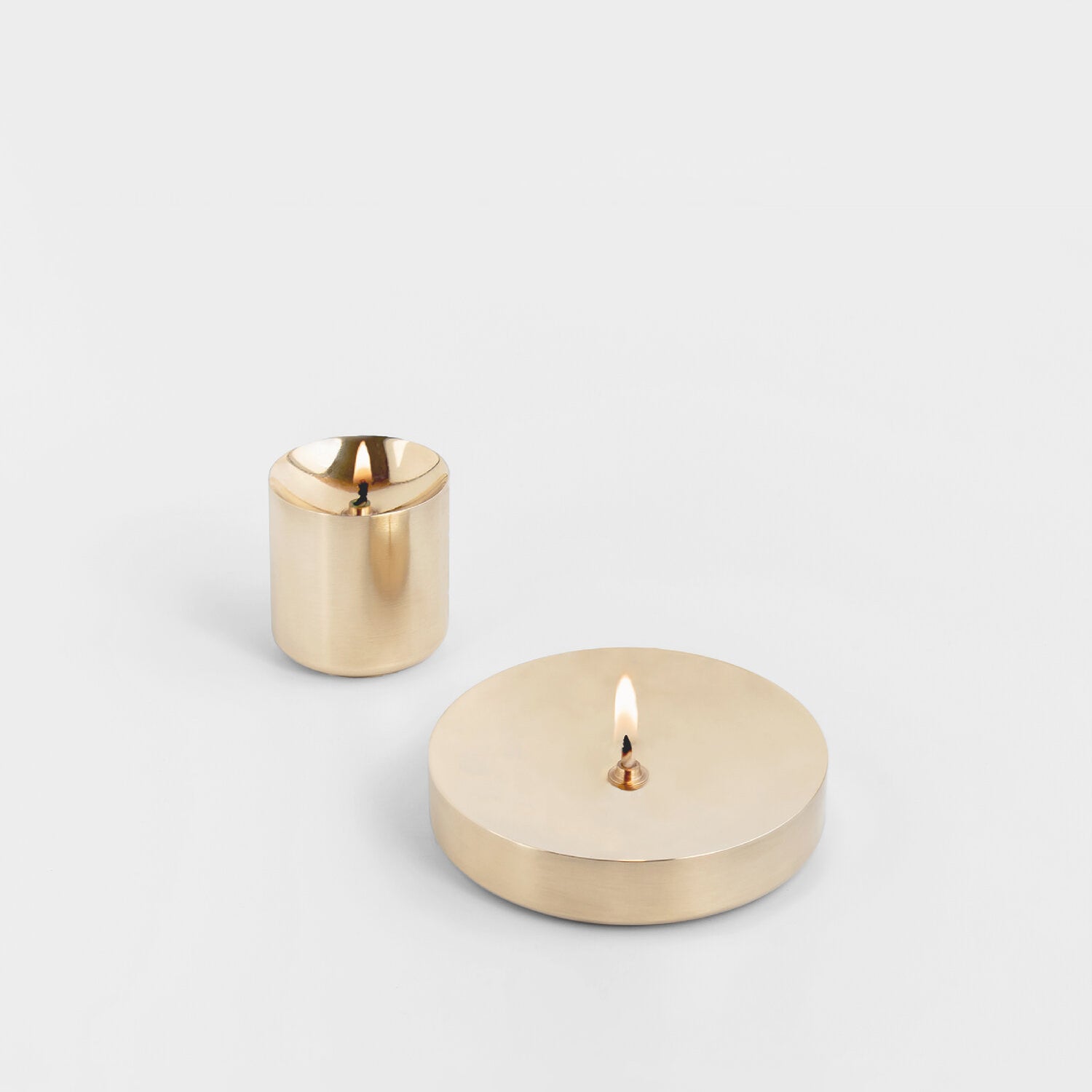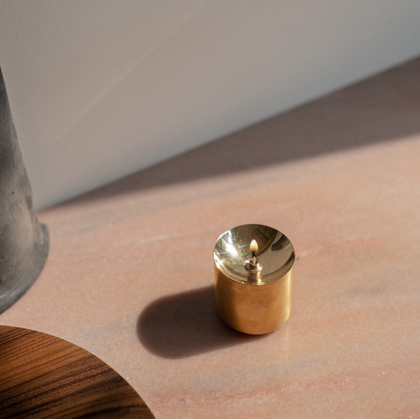 The ‘Dīpā’ oil lamp by Casegoods is machined and then finished by hand in solid brass. The untreated brass cylinder houses an oil reservoir to fuel the cotton wick. The polished concave spherical centre softly reflects the flickering light and enhances the flame. The package contains an oil lamp, a wick and a wick holder.