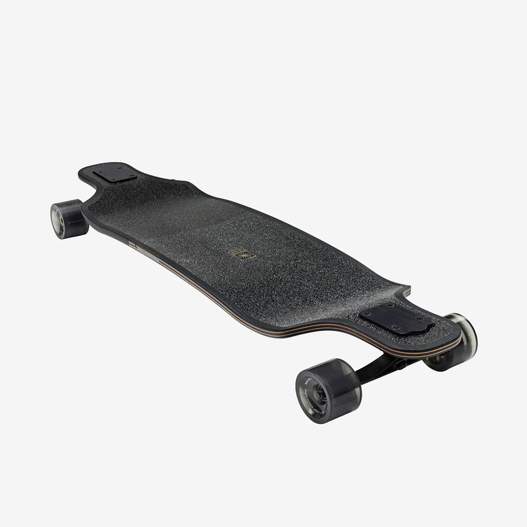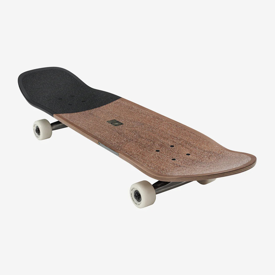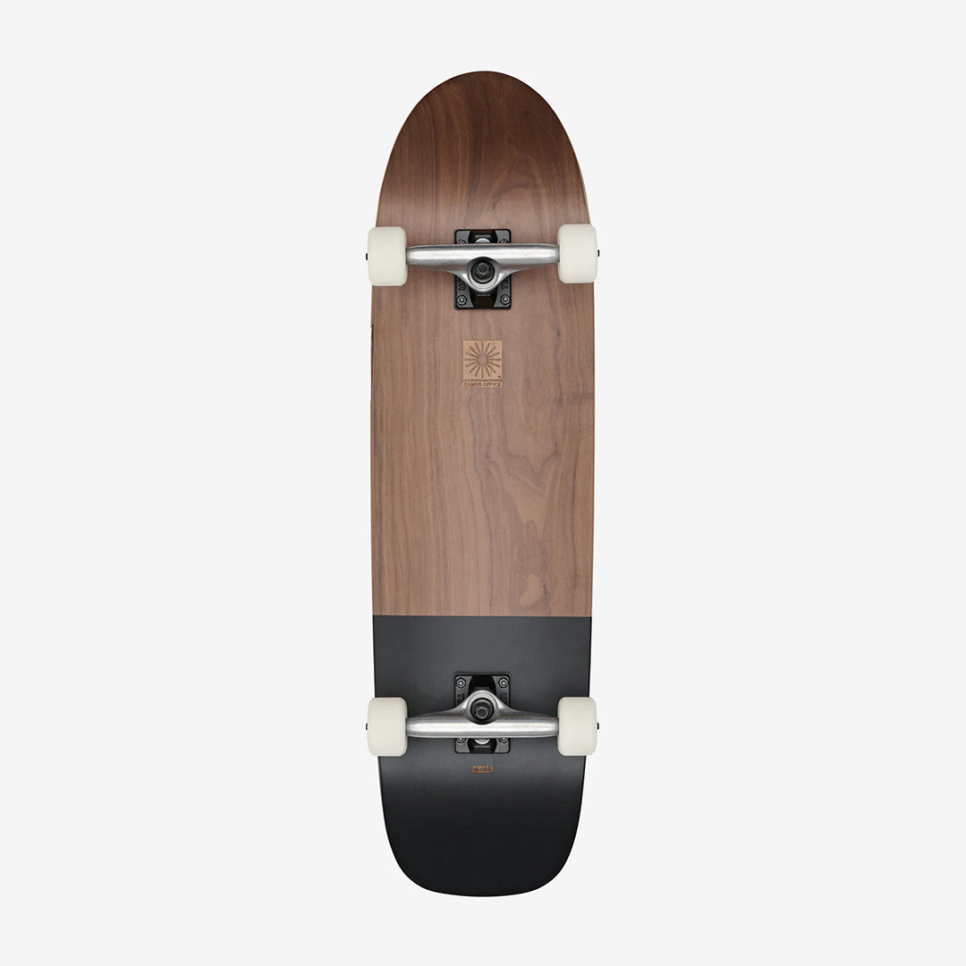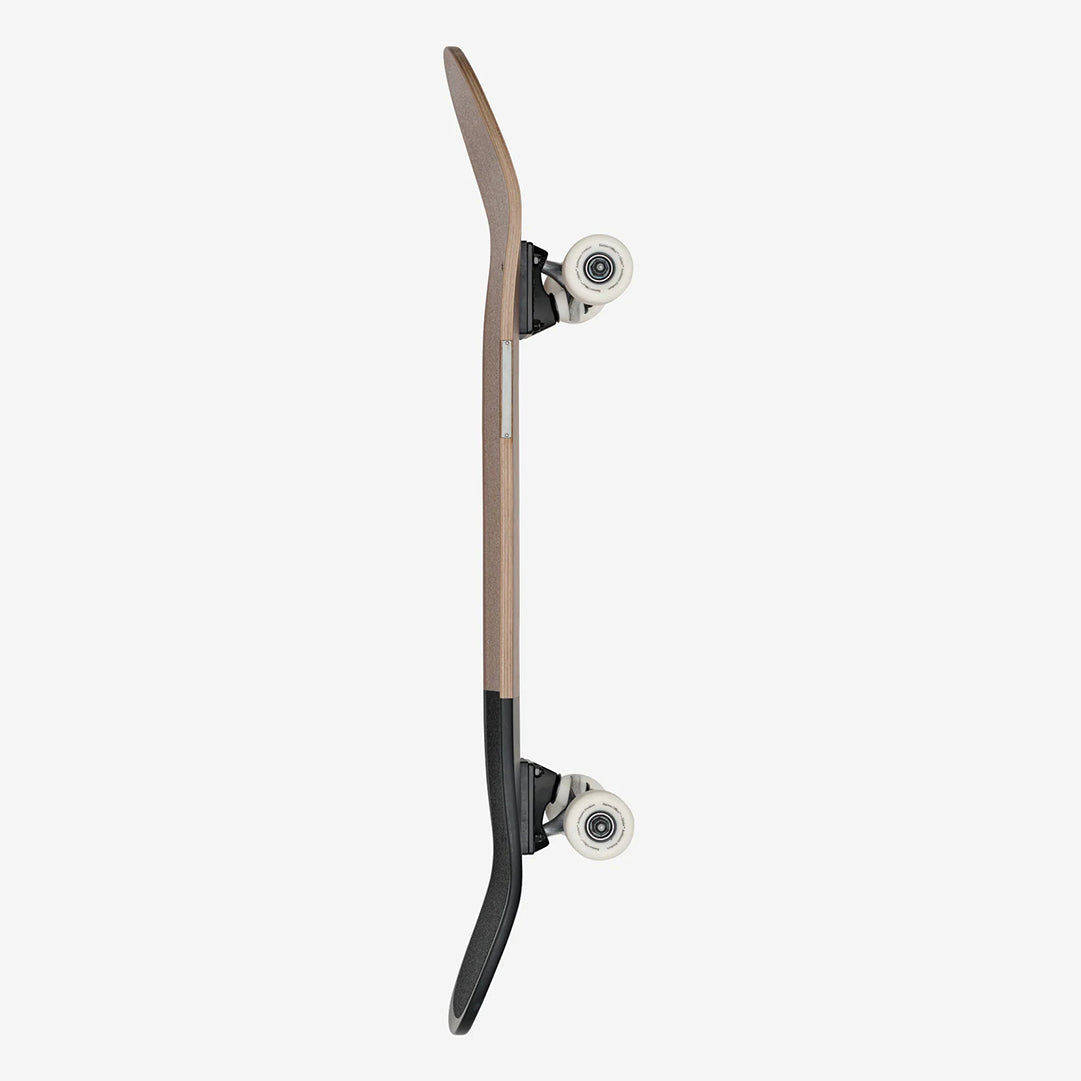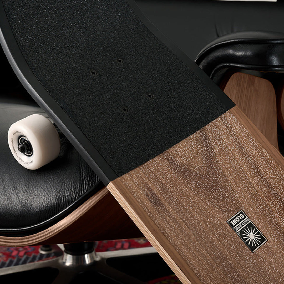 A skateable cruiserboard methodically detailed in resemblance of the famous Eames Lounge Chair and Ottoman. The Eames Lounge Cruiser in Walnut/Black is a Walnut and Canadian maple deck with mellow concave, a steep nose and tail kick. It features custom Eames Office + Globe details with embedded metal badges and deck bolts with the Eames logo. The board has design details throughout matched to the Lounge chair like Rubberized grip and flat edges, mimic the finish of the chair.