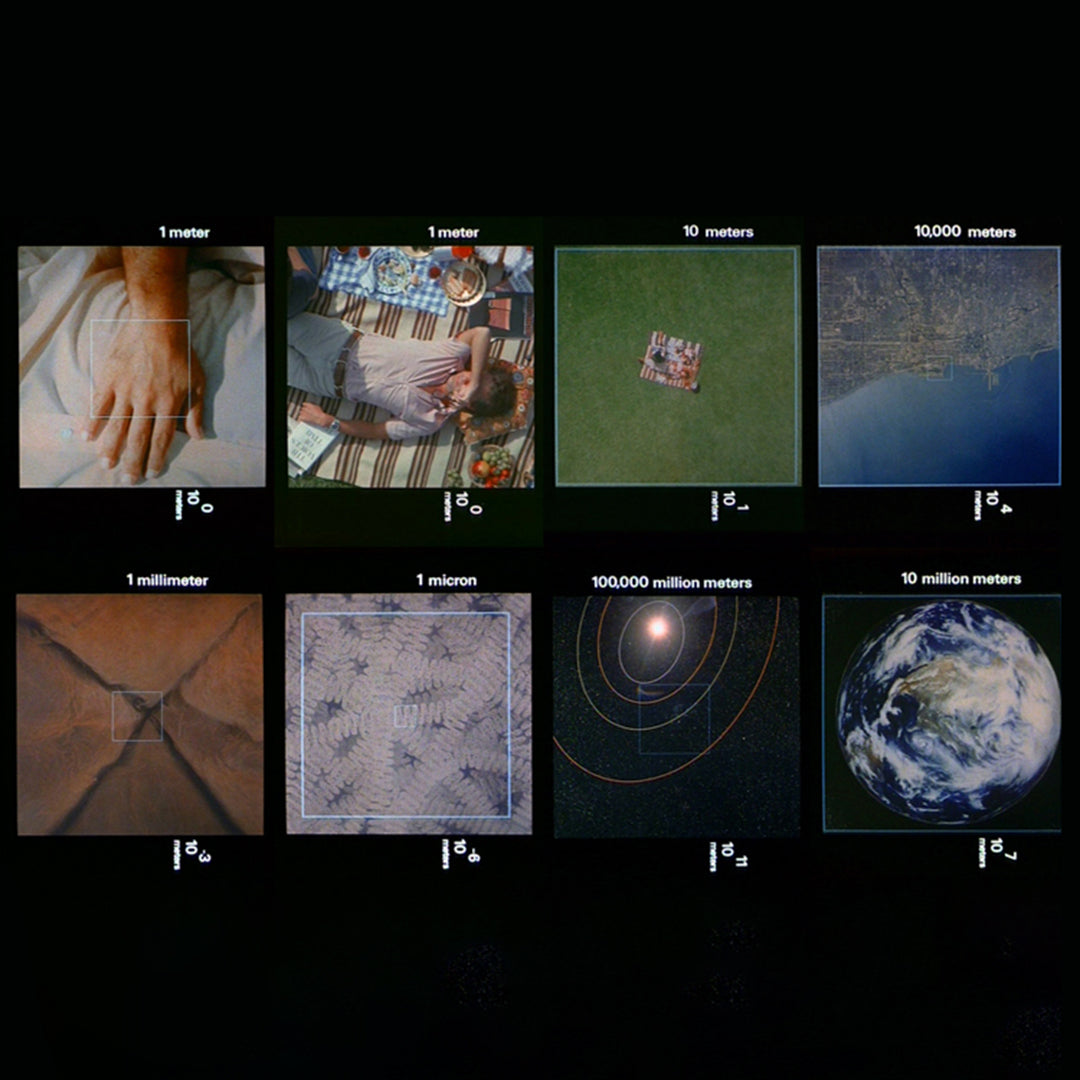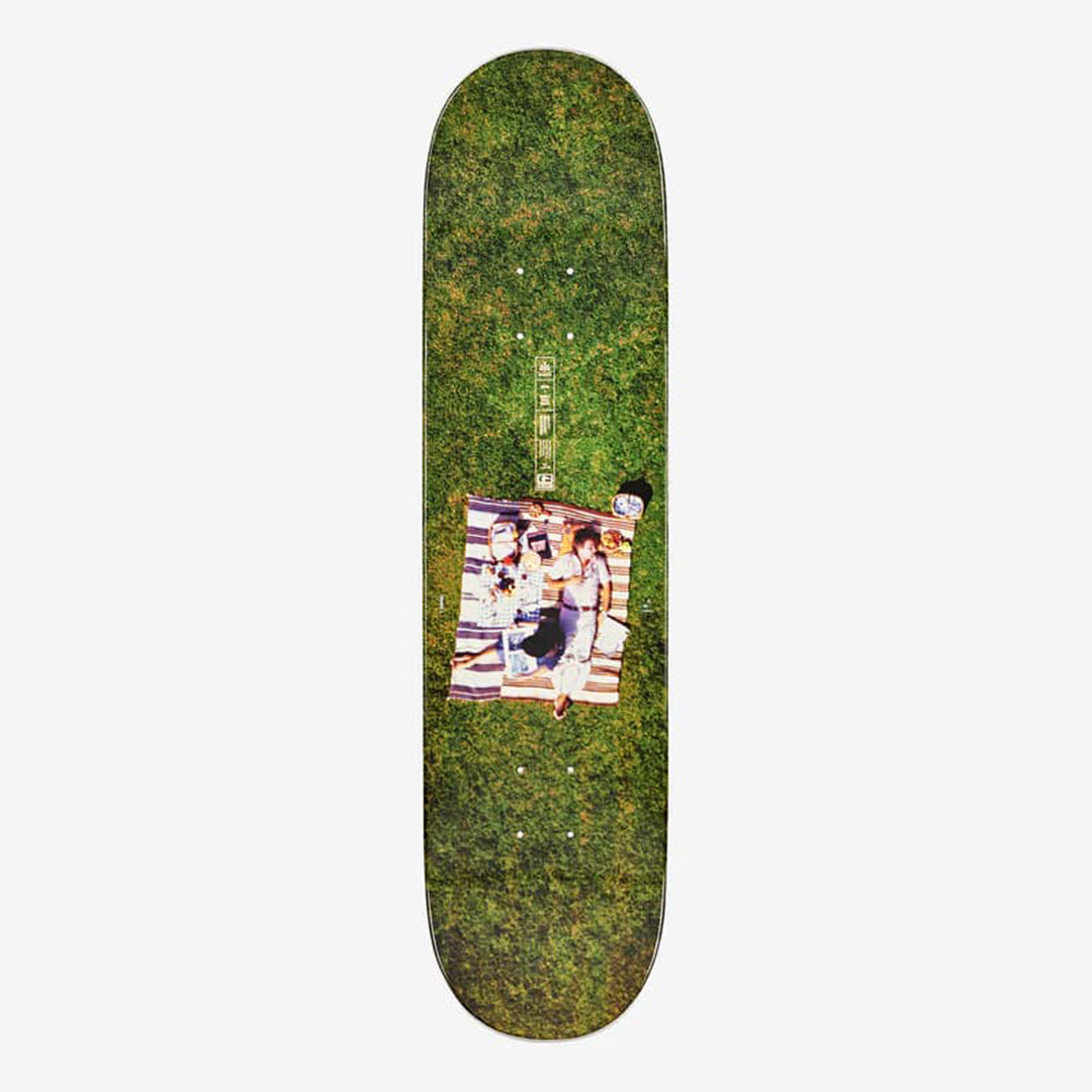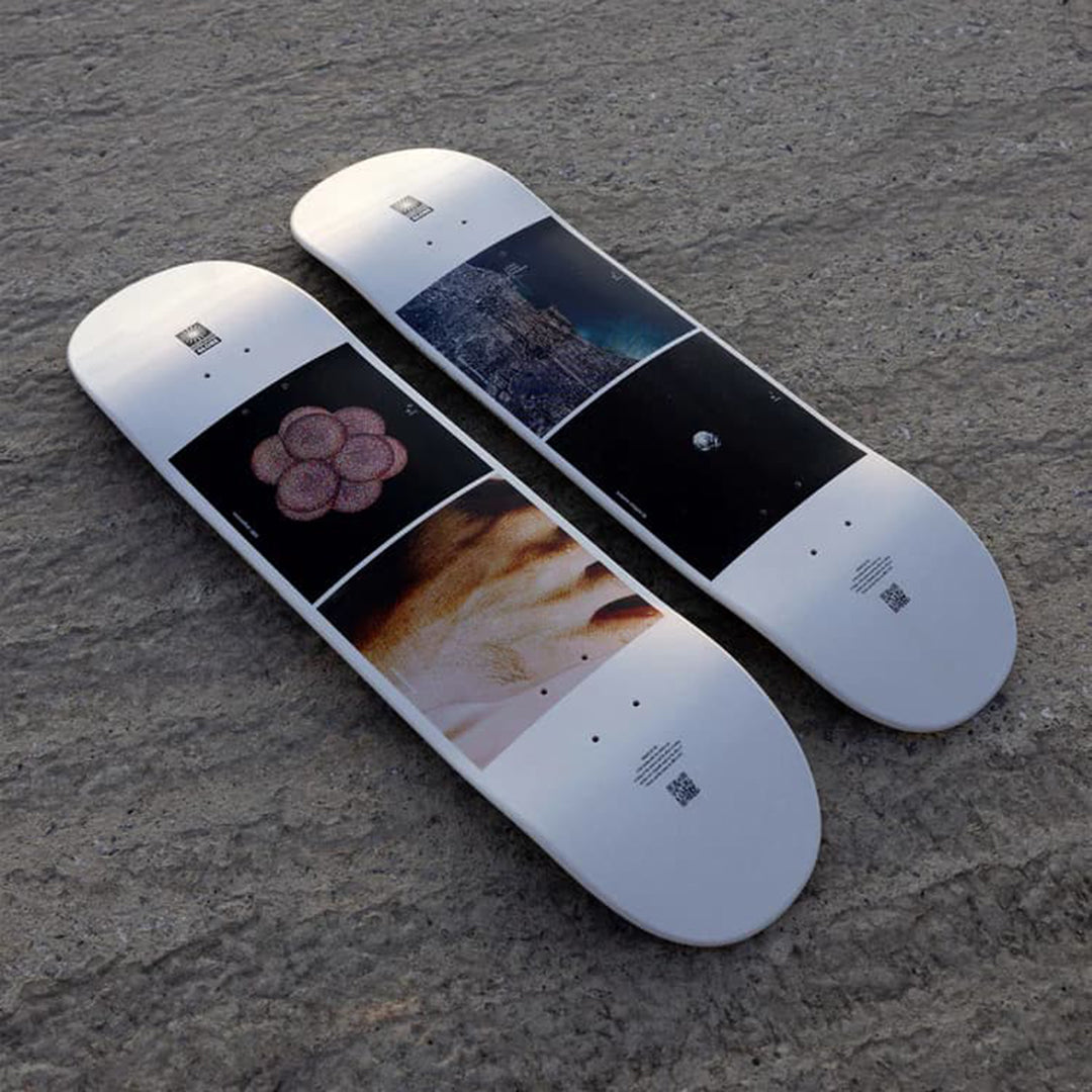 A tribute to the timeless and revolutionary 1977 film by Charles & Ray Eames 'Powers of Ten'. Exploring the relative size of things in the universe by simply adding a zero. White dipped decks featuring select frames from the 1977 film The Eames Powers of Ten Decks features select frames from the 1977 film as it pans up from the picnic scene featured on top upwards towards the cosmos. Made of Resin-7 Canadian maple and features full concave, photos printed over white paint dip. Comes with wall hanger included.
