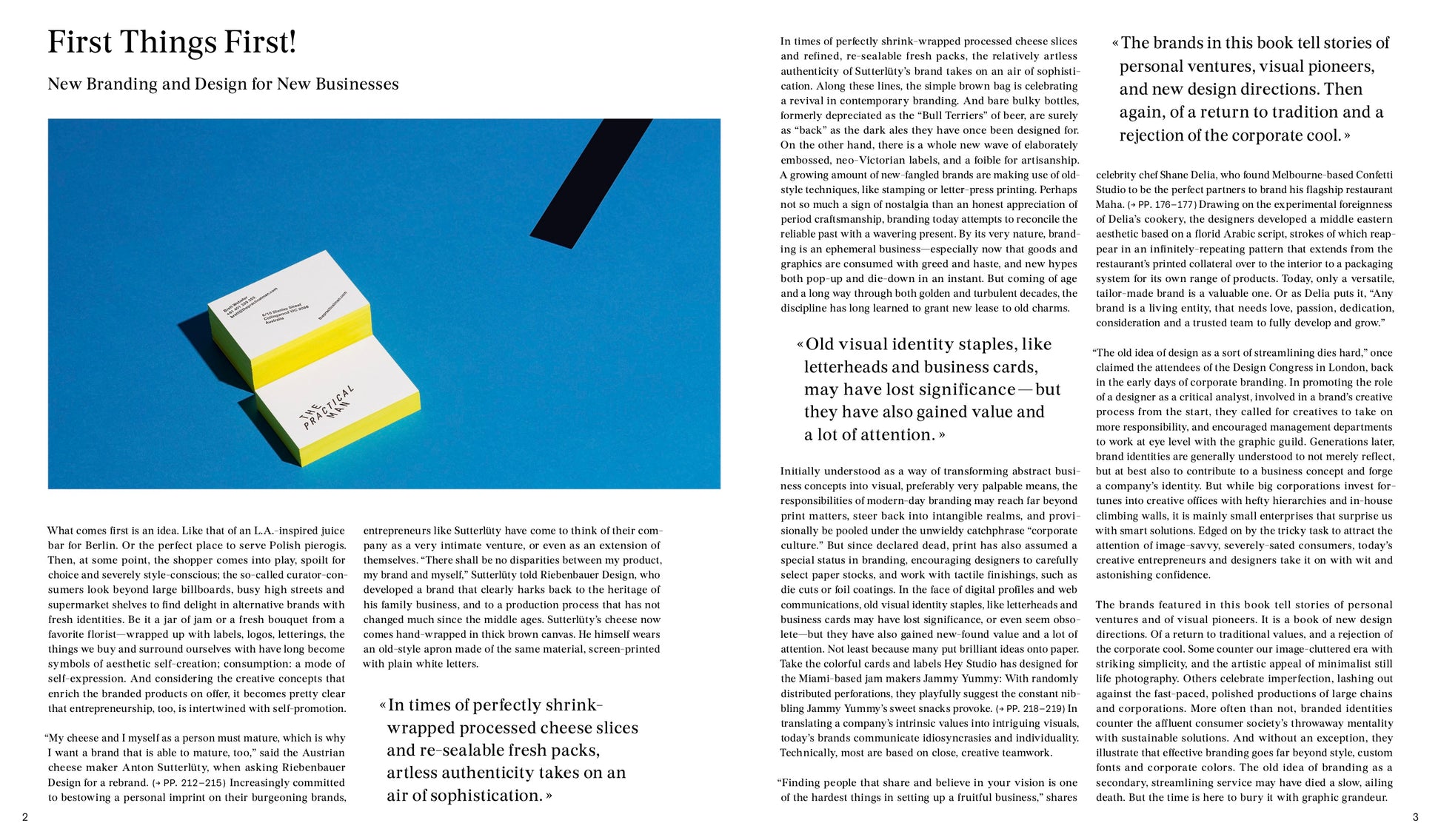 Striking corporate design is a must-have for any new business. For the outsiders and first-timers entering the market, corporate design is not an add-on, it is part of the soul of the business itself. And it demands fresh ideas unfettered by standard approaches. First Things First! presents real examples from shop owners and mechanics, dentists and organic farmers —businesses discovering corporate design for the first time —as well as from traditionally creative companies like marketing agencies or restaurants, and hotels. With profiles and photographs it explores their novel approaches to corporate design.