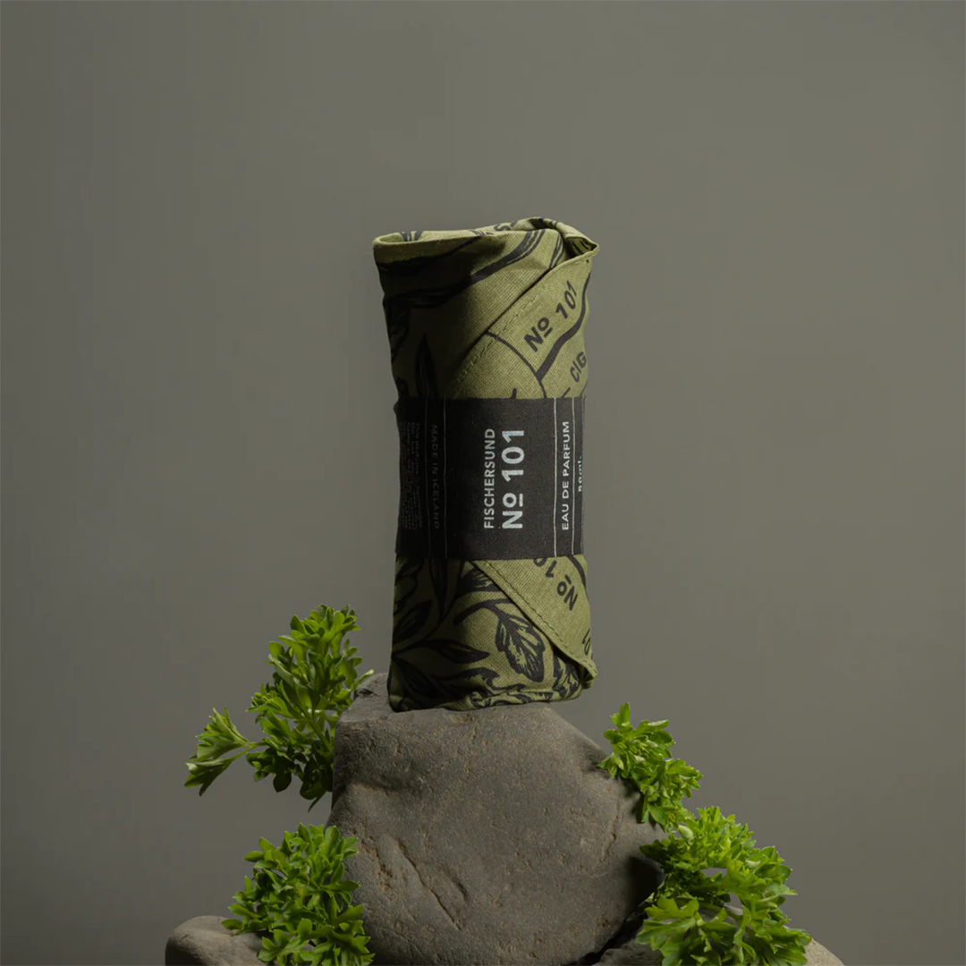 The launch is accompanied by Bakgarðar, a whimsical song composed by Jónsi, Sin Fang and Kjartan Holm that interprets the scent available via a QR code. Each bottle is hand-poured and hand-wrapped in a sustainable Fischersund No. 101 Bandana featuring imaginative illustrations inspired by the new scent drawn by the skillful hands of Fischersund sibling and co-founder, Ingibjörg Birgisdóttir. These signature bandanas have quickly become collectors' items donning necks, hair, and wrists of people near and far.