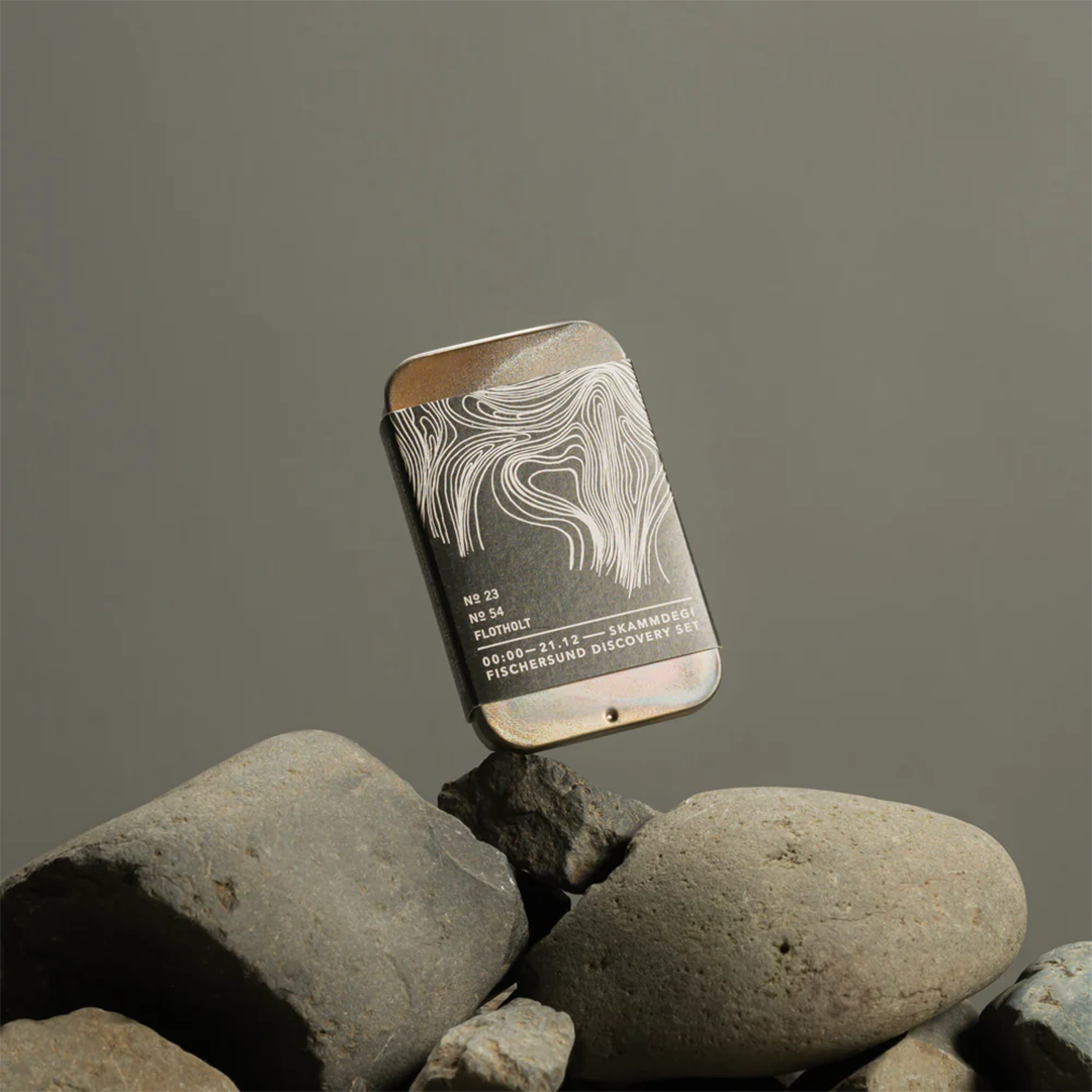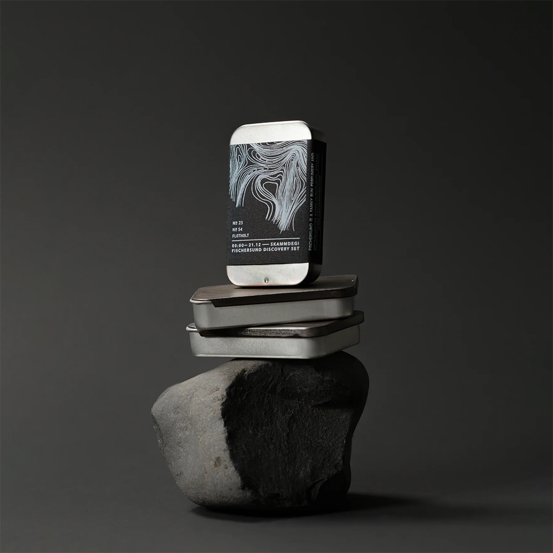 The set is housed in a hand-treated tin box made by our father Birgir, and features fragrances - No. 23, No.54 and Flotholt. A perfect way to discover your new fragrance favorite.