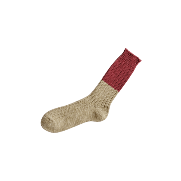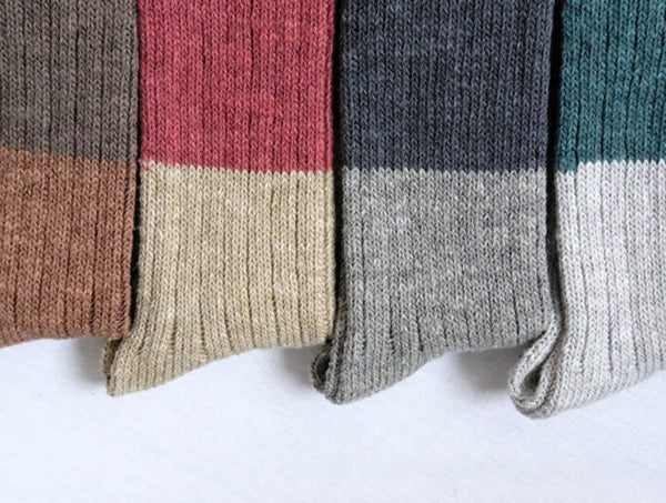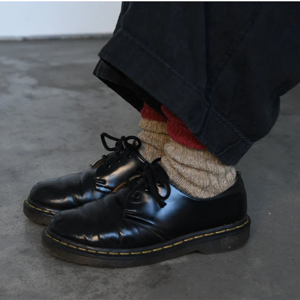 Wool and cotton are gently intertwined to create these wool-cotton socks. The vintage look and comfort maximizes with wear. These rib-patterned socks are created with wool and cotton that are gently twisted into slab style weaving. This type of weaving gives these socks a casual look and the gently intertwined yarn envelops your feet with softness and warmth. The vintage look and comfort maximizes with wear. Wool and cotton absorb the dye at different time frames. We like the variance of tones created by the dyeing process as it adds to this casual and playful look.