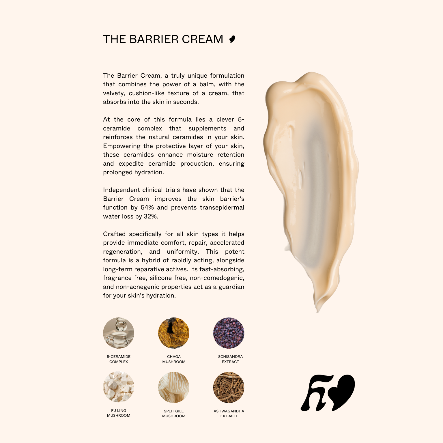 INGREDIENTS: Aqua, Glycerin, Butanediol, Simmondsia Chinensis (Jojoba) Seed Oil, Limnanthes Alba (Meadowfoam) Seed Oil, Cetearyl Alcohol, Trehalose, Butyrospermum Parkii (Shea Butter), Raphanus Sativus (Radish) Root Ferment Filtrate, Poria Cocos (Fu Ling) Extract, Withania Somnifera (Ashwagandha) Root Extract, Cyclodextrin, Cetearyl Glucoside, Hydrogenated Lecithin, Schizandra Chinensis Fruit Extract, Tocopherol Acetate, Polyacrylate Crosspolymer-6, Inonotus Obliquus (Chaga) Extract, Panthenol, Saccharide Isomerate, Hyaluronic Acid, Ceramide NP, Glucose, Schizophyllan (Split Gill), Hydroxyacetophenone, Sodium 4-oxovalerate, Ceramide NS, Ceramide AS, P-Anisic Acid, Ceramide AP, Ceramide EOP.