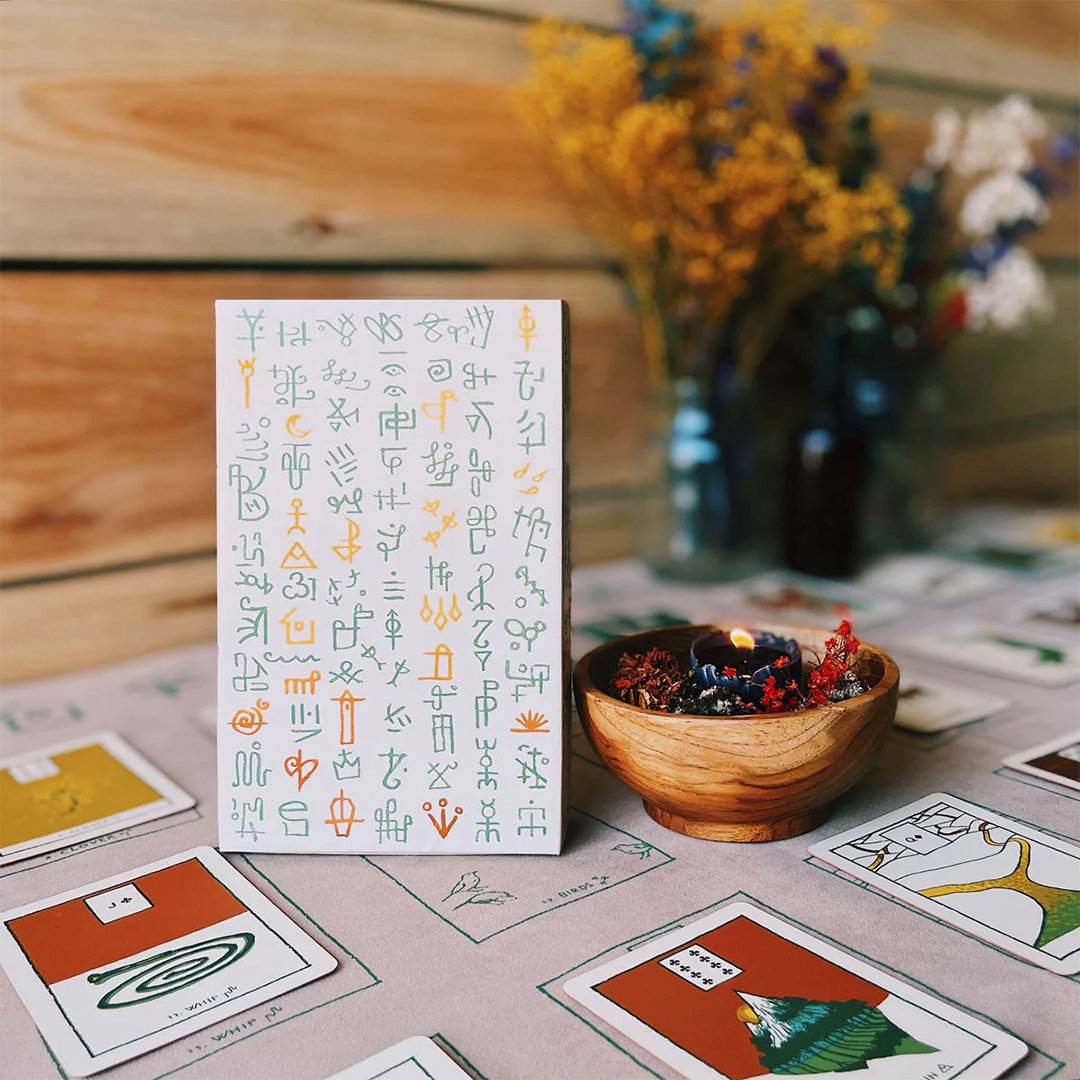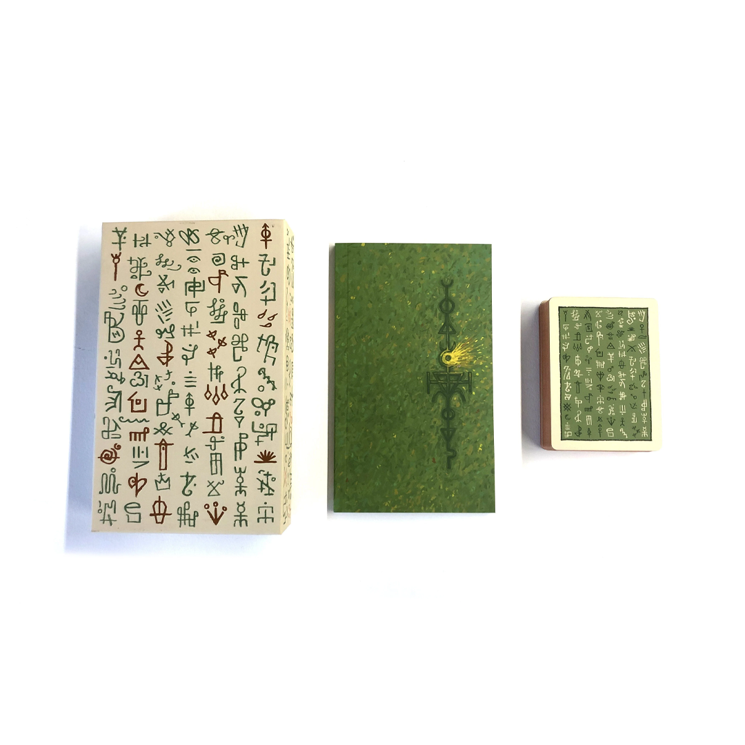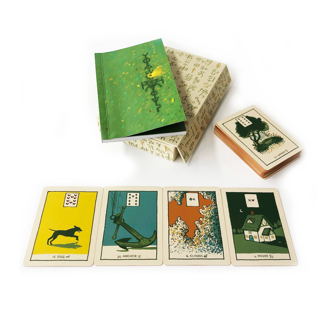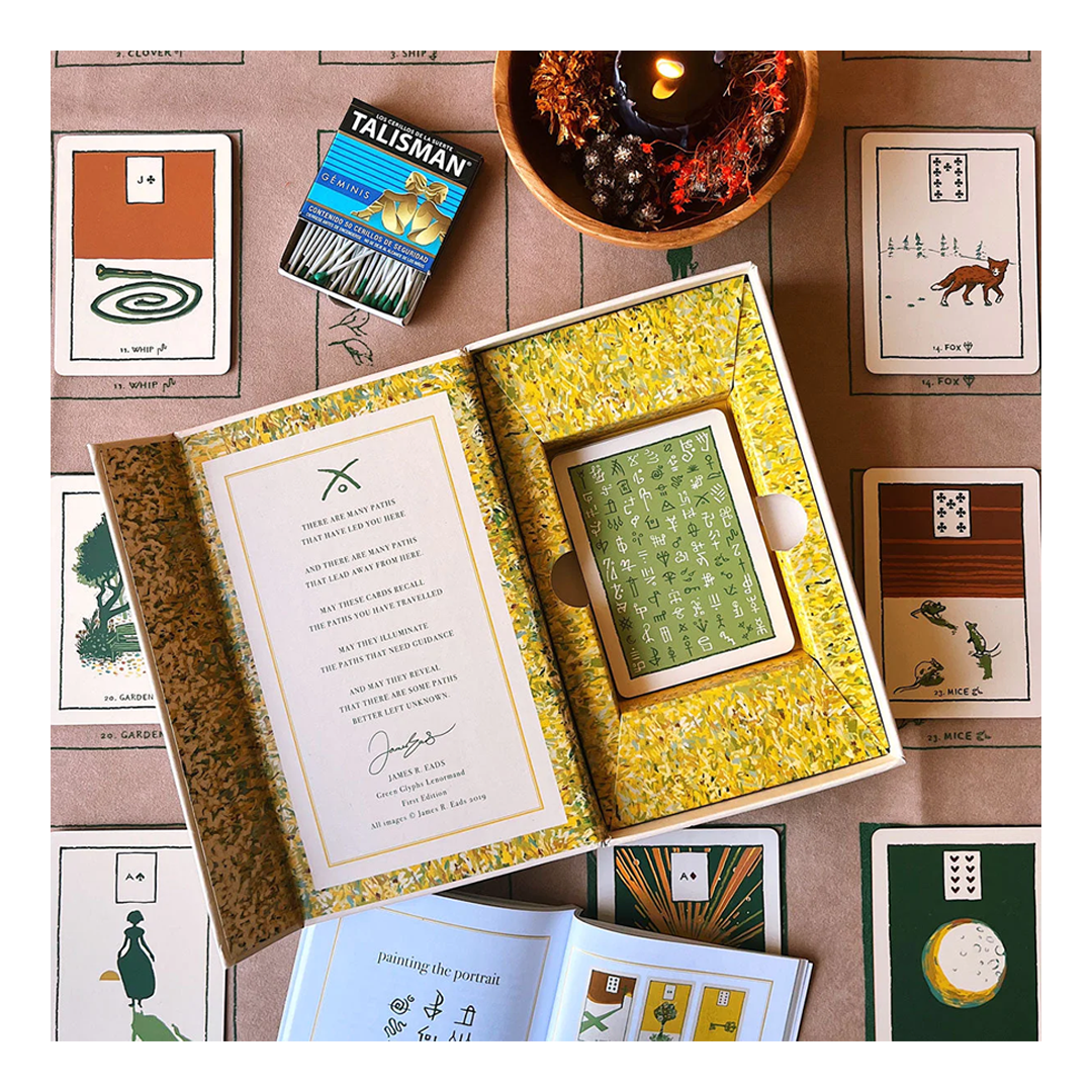 - THE GREEN GLYPHS GUIDE 80 page full color guide (measuring 10 x 16.5cm) that offers a brief introduction to reading your Lenormand deck and answers some of your burning questions about Lenormand including how to read a Grand Tableau and instructions on how to play The Game of Hope a multiplayer game that uses all 36 cards as a board game!