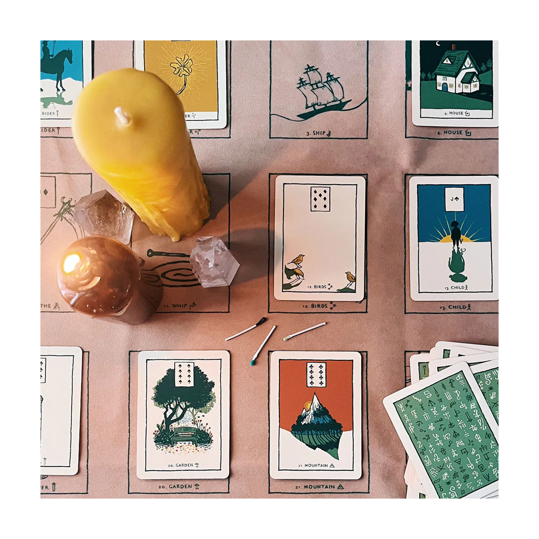 A deck of 40 Lenormand Cards & instructional booklet housed in a magnetic flip-top box.