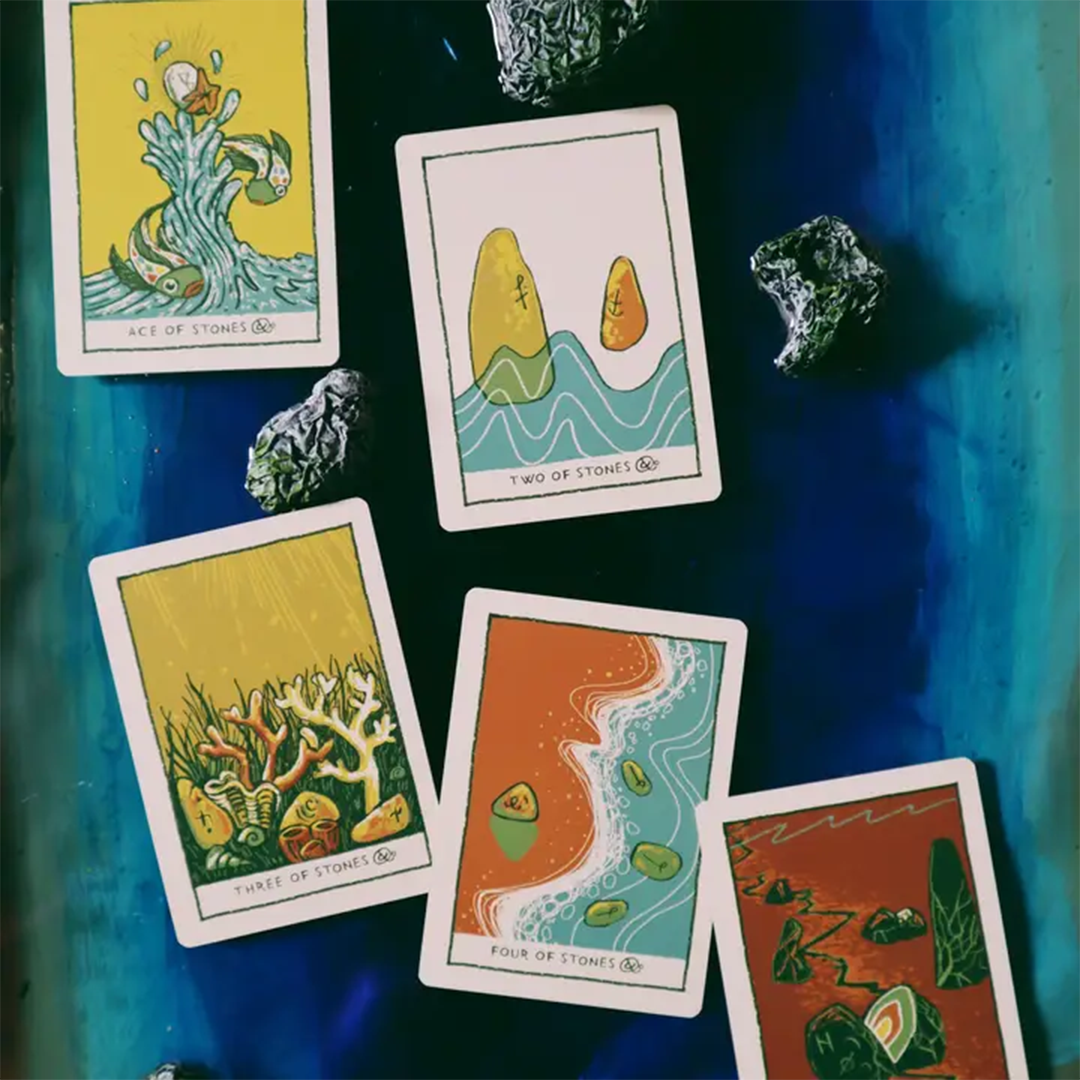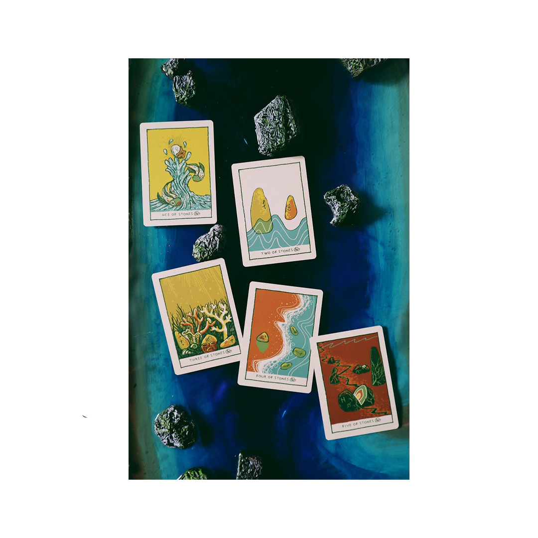 "The Green Glyphs Tarot follows the meanings of the traditional tarot system. For Tarot beginners, this is an excellent deck to begin with as the cards are color-coded based on the presence of the card. Cards with a large presence of yellows and gold are generally uplifting and cards with orange are unfortunate. A Tarot deck is split into two parts: the major and minor arcana. The deck begins with the major arcana, a group of 22 cards that explore the fool's journey and the cyclical nature of life and when assembled side by side form a long panoramic image that links back to the start. The minor arcana is comprised of 56 cards split into 4 different suits. Each suit tells a myth or story and takes the reader on a journey as an additional aid in understanding the intricacies of each suit." - James