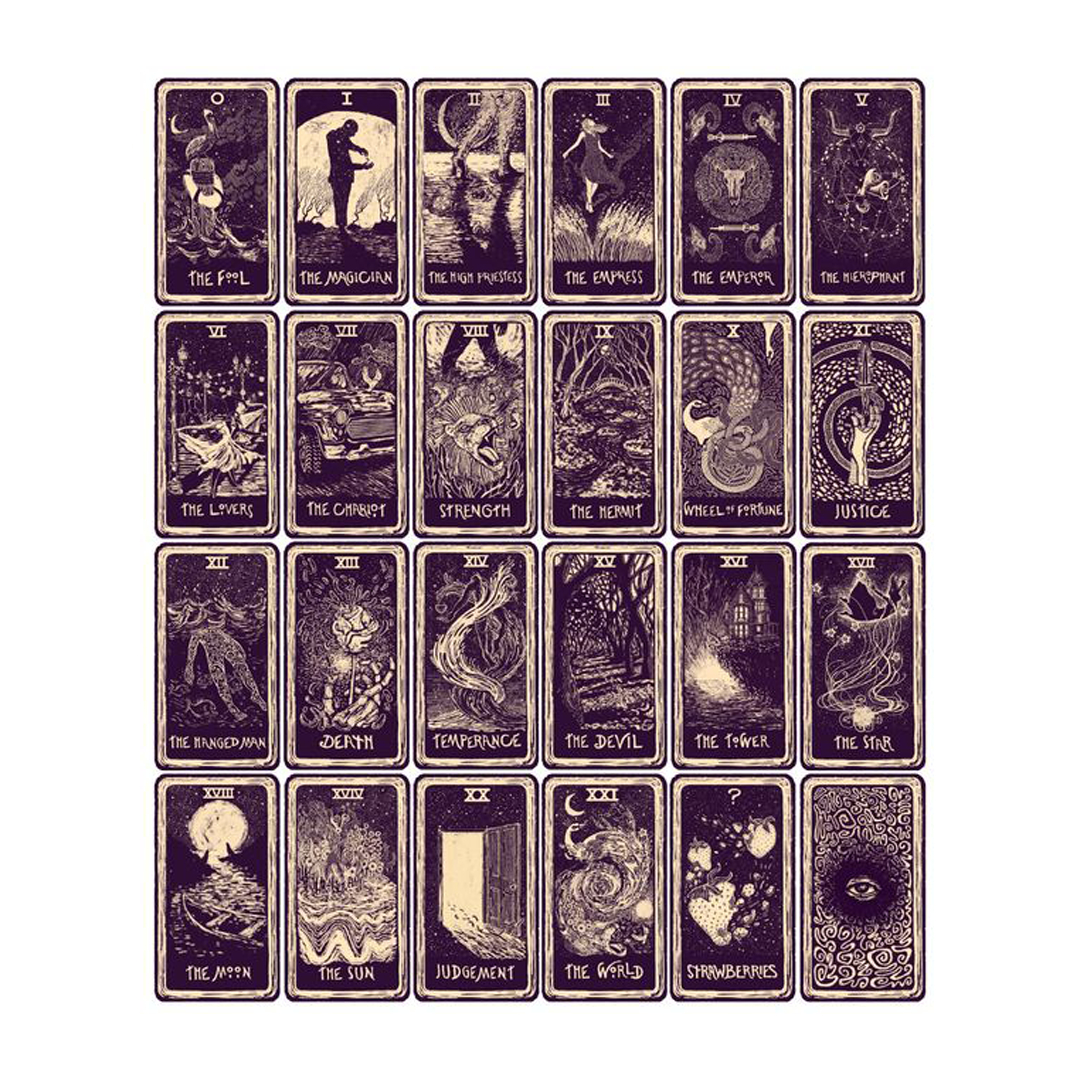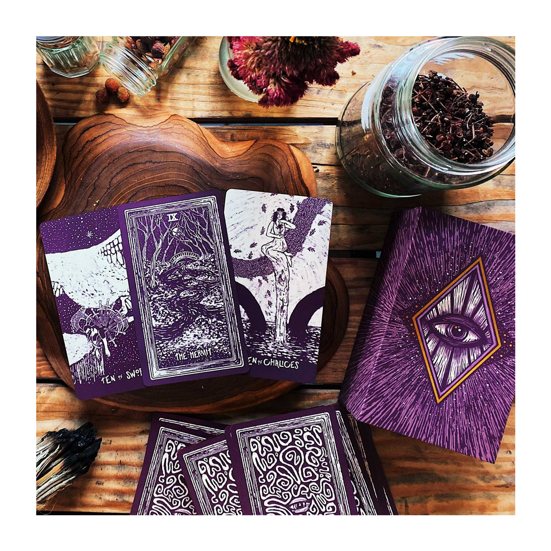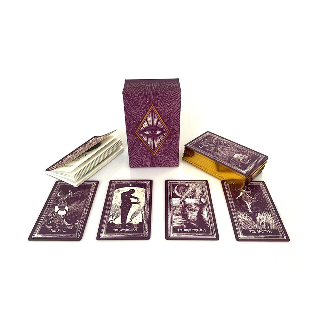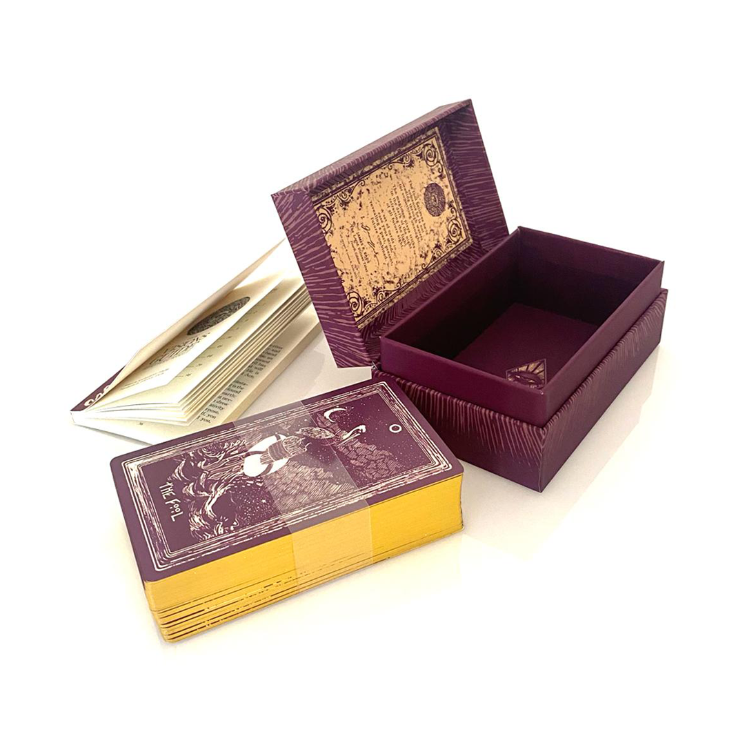 - THE CARDS are approximately 7 x 12 cm and all share identical backs. They are two-toned deep purple and a light cream color. The 79 cards are printed with the highest quality inks on durable matte cardstock and edged with reflective gold gilding.