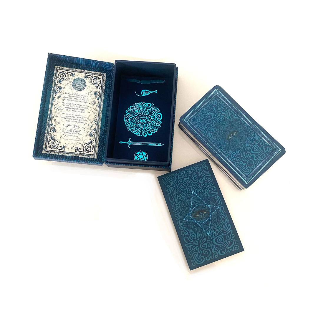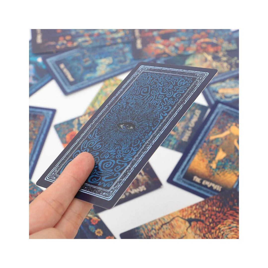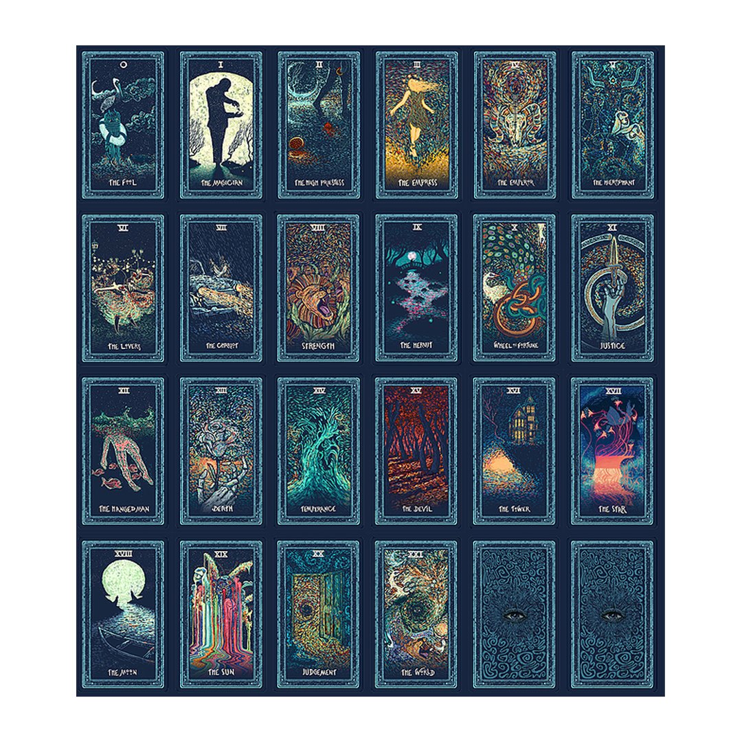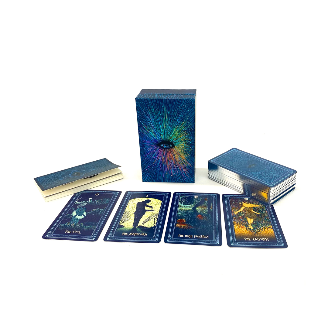 - THE CARDS: 79 cards, each is approximately 7 x 12 cm and all share identical backs. The cards are printed with the highest quality inks on durable matte cardstock and are finished with a matte UV protective layer and edged with mirror-like metallic silver.