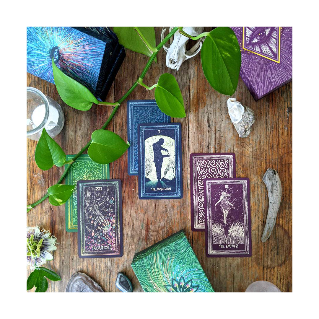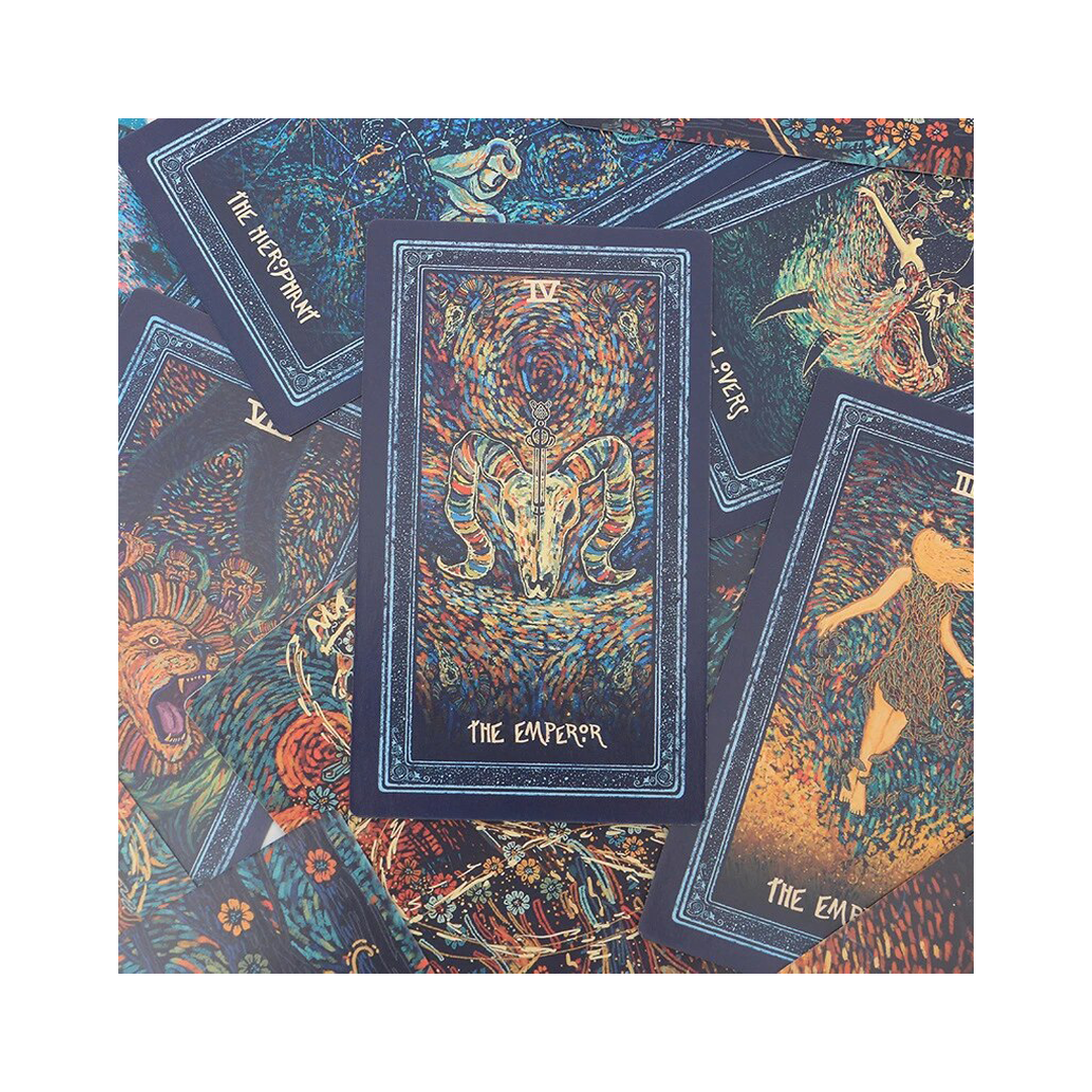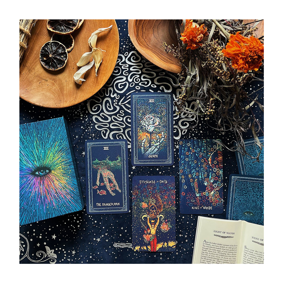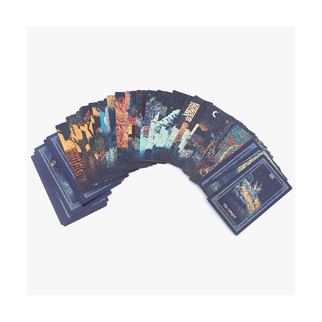 - THE CARDS: 79 cards, each is approximately 7 x 12 cm and all share identical backs. The cards are printed with the highest quality inks on durable matte cardstock and are finished with a matte UV protective layer and edged with mirror-like metallic silver.