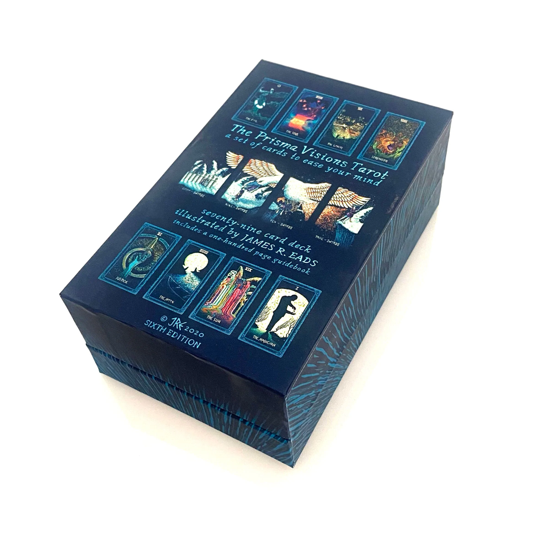 Prisma Visions Tarot Sixth Edition, with a new matte finish and holographic accents inside the flip-top box. Featuring the 79th card, Tiny Elephants.