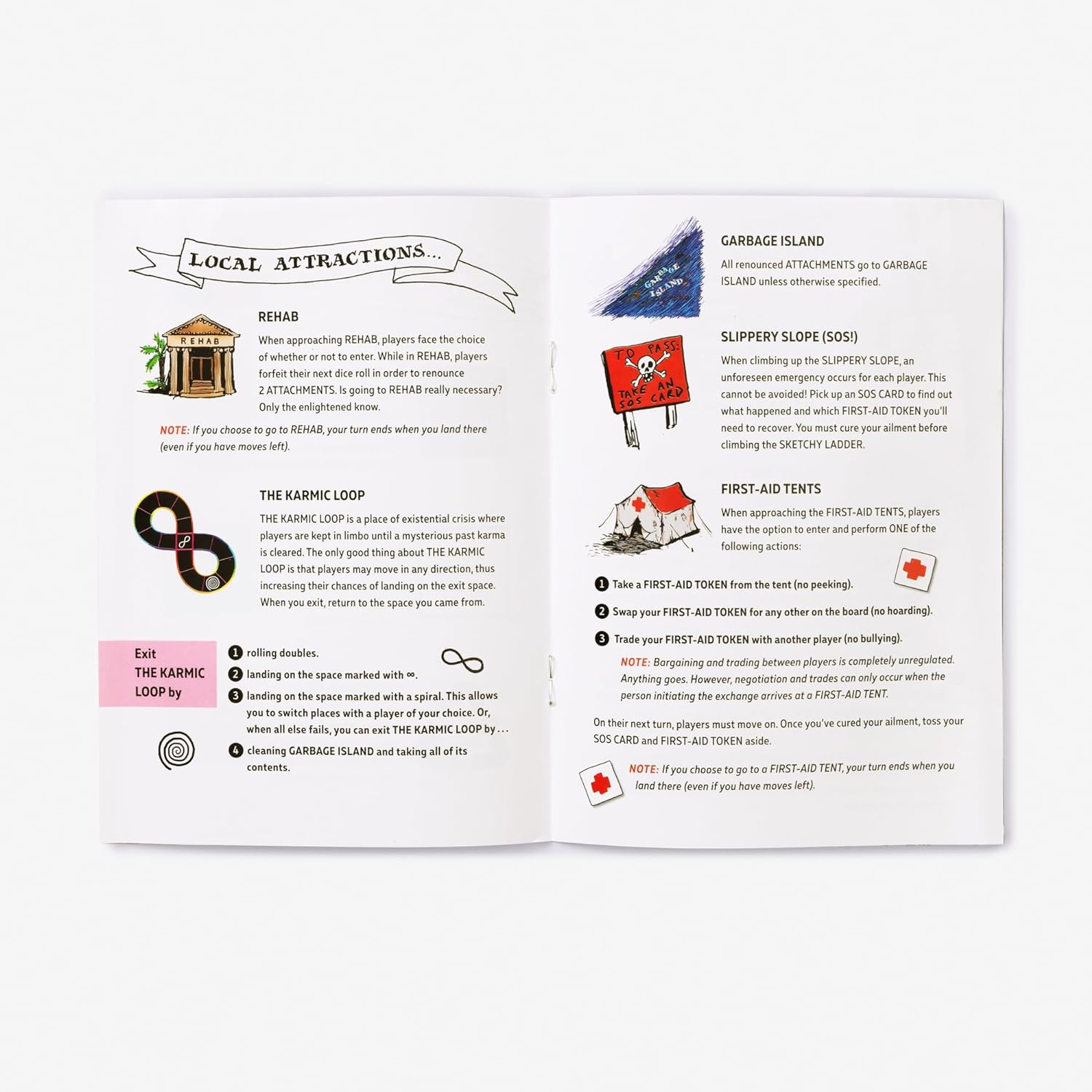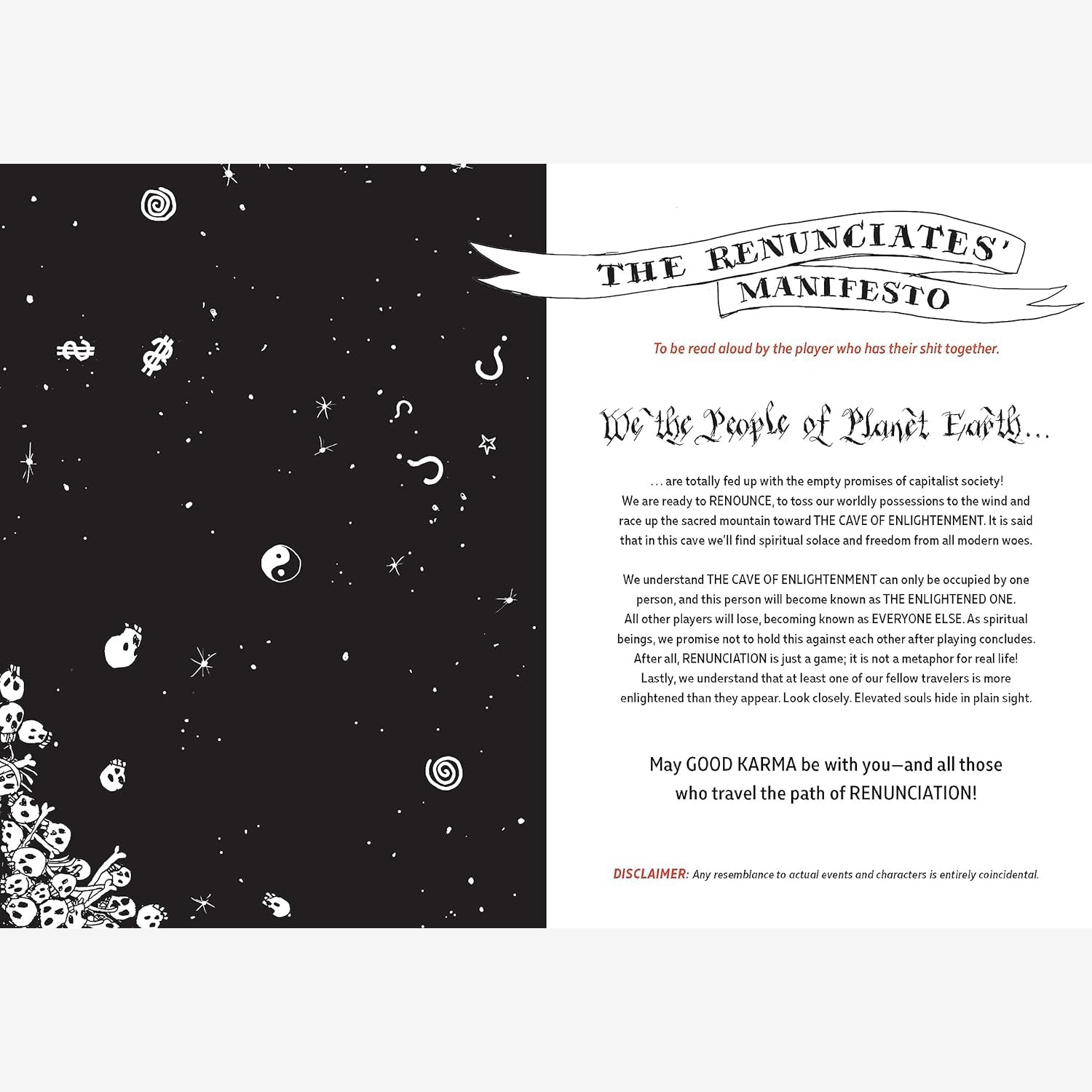 In this cutthroat competition against karma itself, two to six players—with the help of the game's "Adventure Guide" - will embrace new personas and race up the sacred mountain toward the cave of enlightenment. The problem: this ancient cave must be entered empty-handed. Players start with a bounty of material possessions and must learn to let go of each attachment, which is easier said than done.