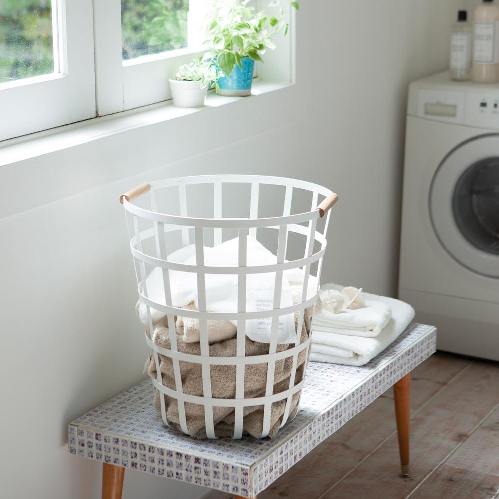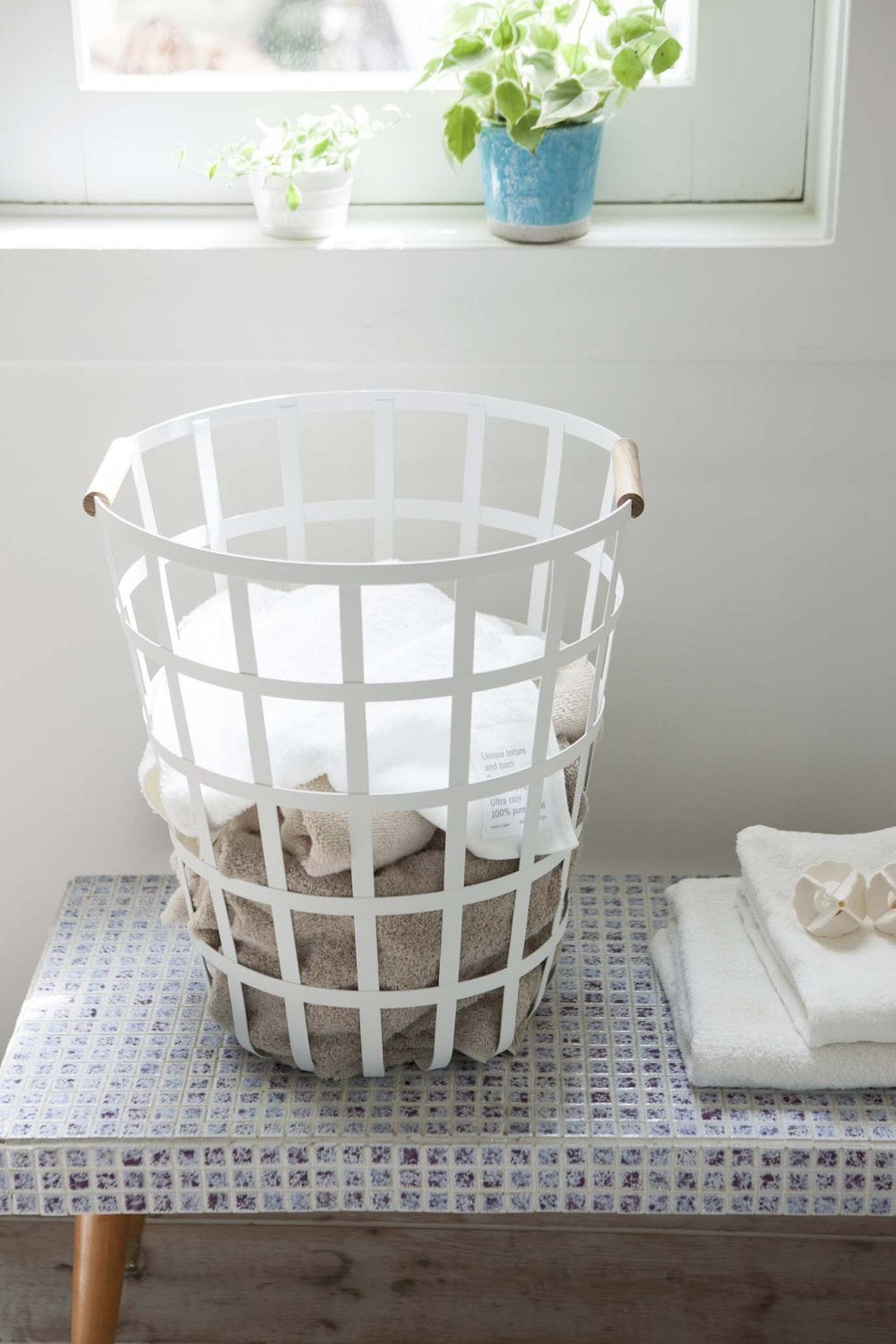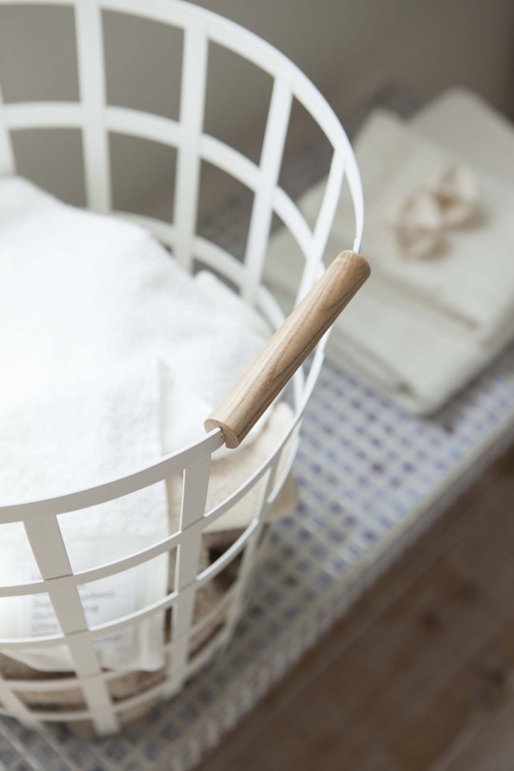 With a white steel frame and wooden handles, this laundry basket adds an elegant charme to your bath or laundry room.