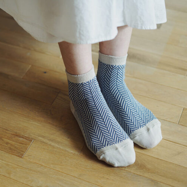 Herringbone patterned socks made from giza cotton. This type of cotton is dry and crisp to the touch resulting in a smooth and comfy fit. They are the perfect accent to spring/summer outfits and even look great with sandals.