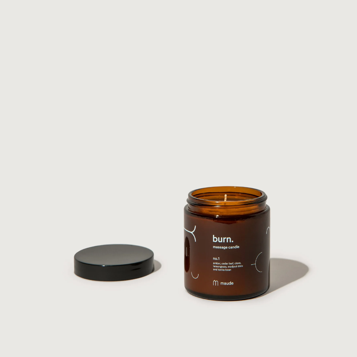 Soy-based massage candle, with warm notes of amber, cedar leaf, clove, lemongrass, medjool date and tonka bean.