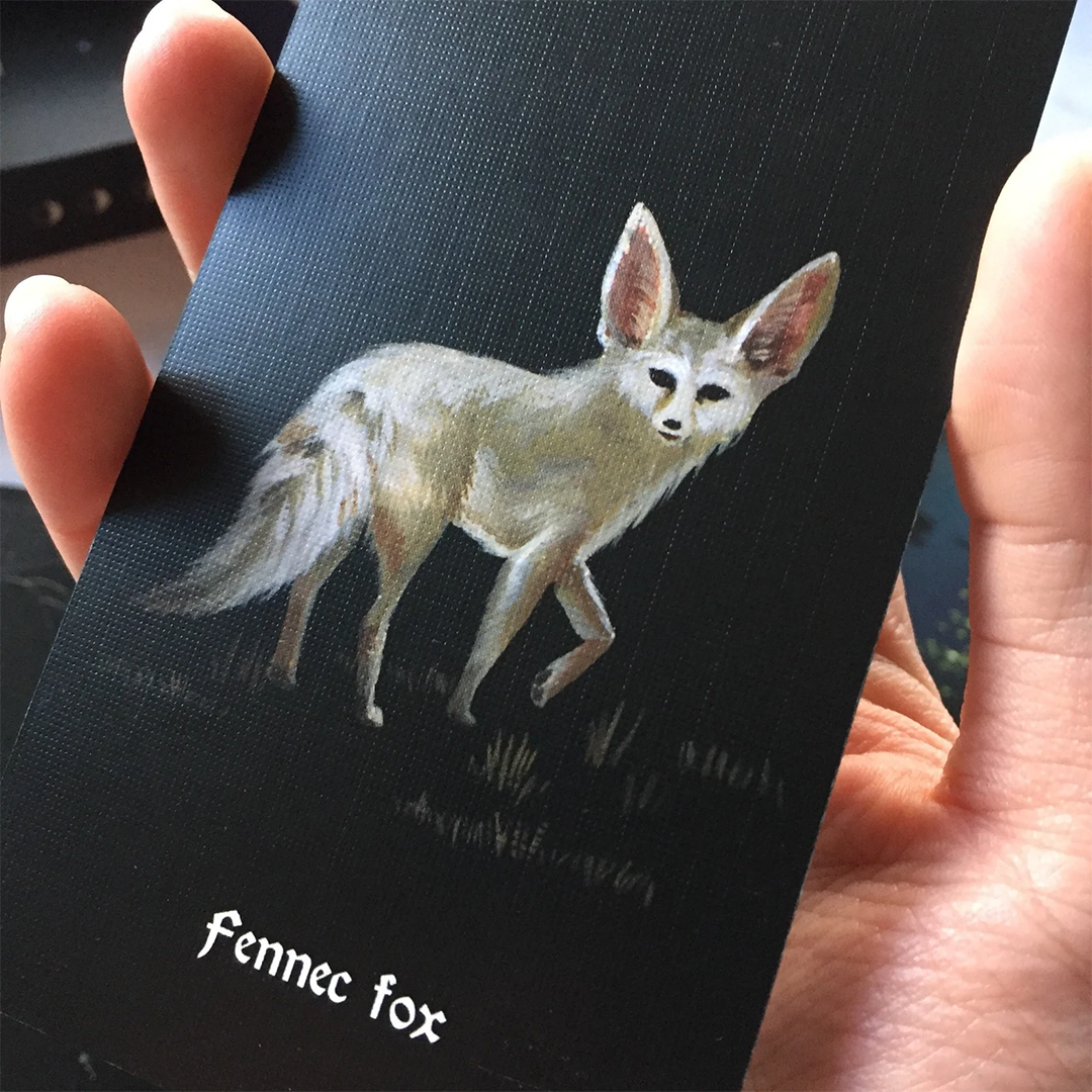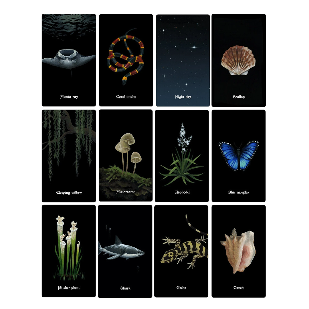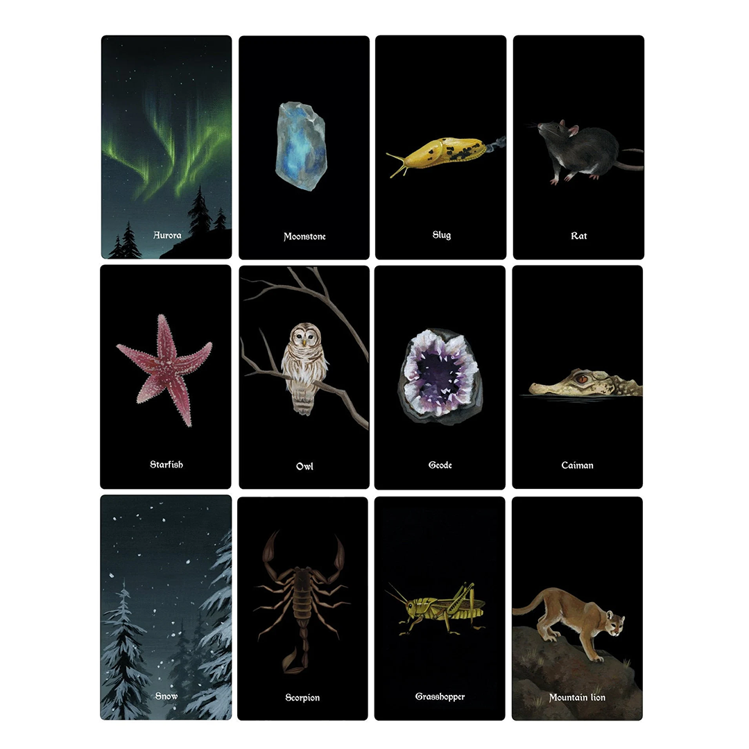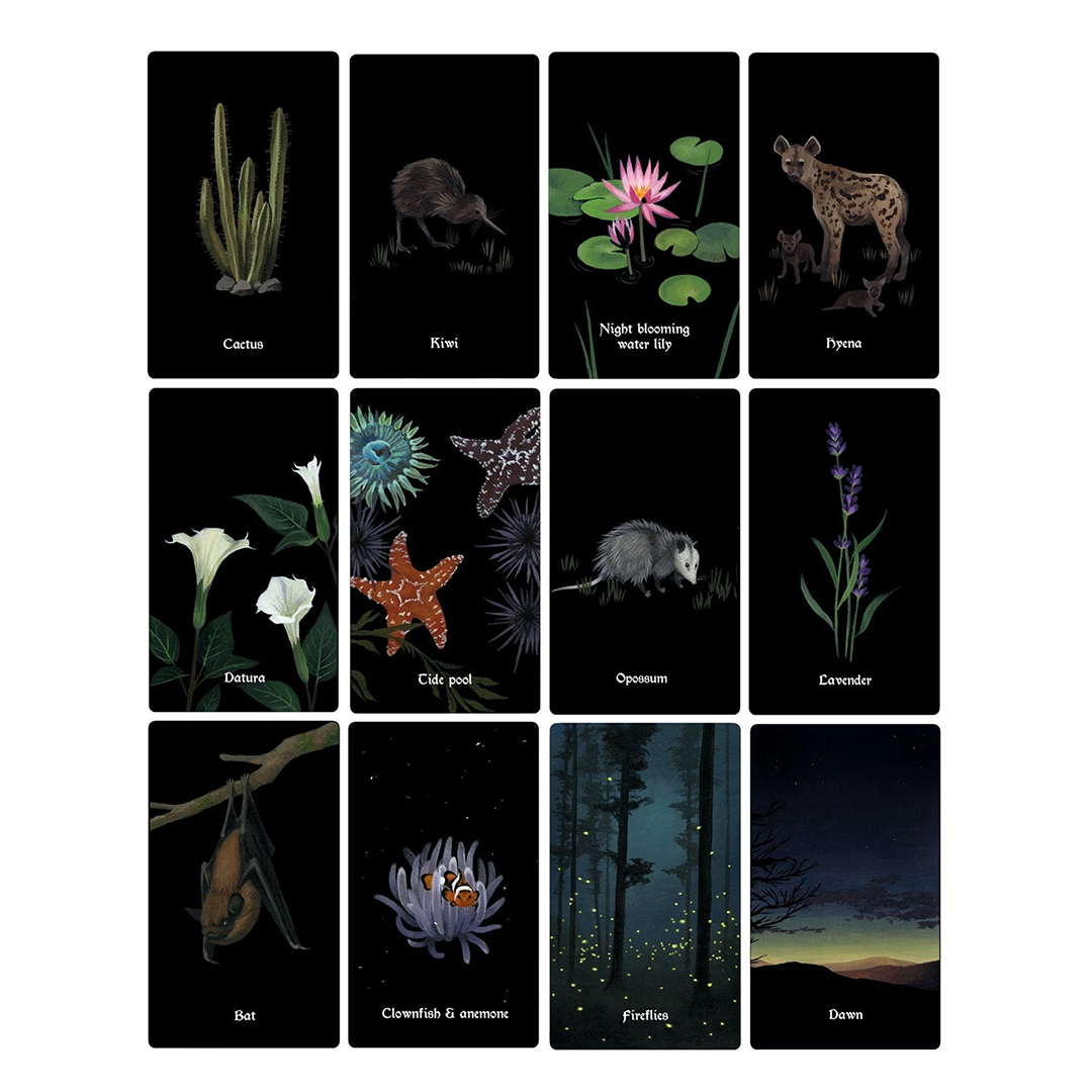 An oracle deck is like a tarot deck, except without a specific structure or archetypes (major arcana, suits, queens etc.). For this deck, I chose mostly plants and animals that are active at night. The deck starts with the "dusk" card as the beginning of night, and ends with the "dawn" card, signifying the first light of day.
