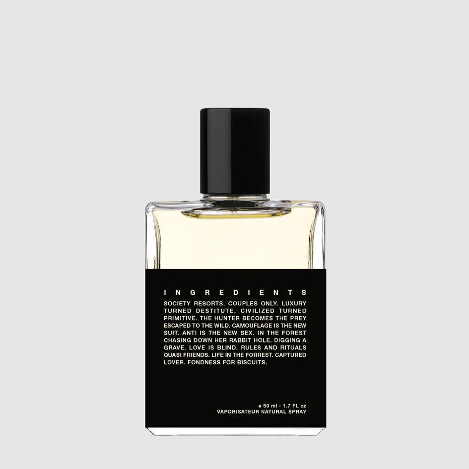 "The cinematography inspired me to render a scenery, landscape and feeling of a couple in a forest. A location where two people are restricted to love, yet fall in love. In the coldness; wind, damp wood, lake and forest leaves they find warmth. In the danger and darkness; The animal and bloody undertones they find comfort and light. This is a fragrance that is ultimately herbal, green, wet, dark, animal and woody, and twisted with a bouquet of wild flower to represent the society they left, the new one they found and will soon leave again." - Mark Buxton