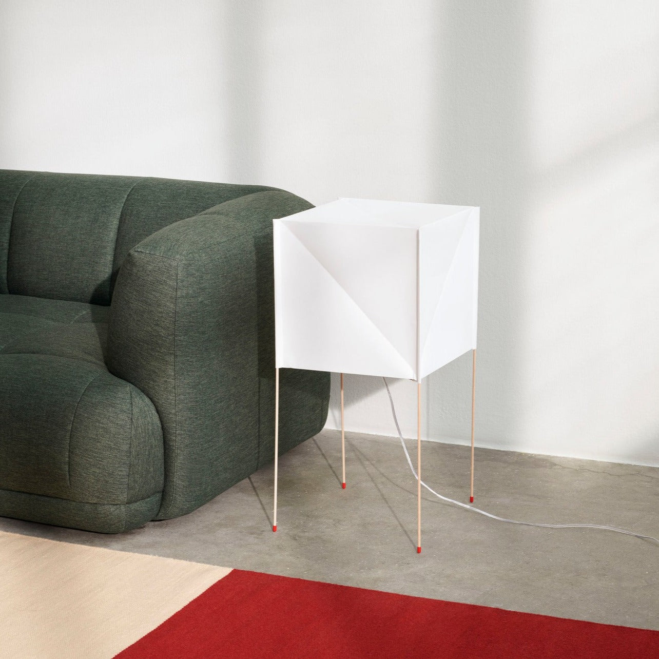 Designed by Bertjan Pot, Paper Cube is a series of elegant and functional cubed lamps. Inspired by the mechanics of constructing folded paper ornaments, Paper Cube has a flat-pack design that is easy to assemble. Constructed from a strong Japanese paper material, made from recycled PET bottles, and with FSC-certified beech legs, the translucent shade has a closed volume that creates a soft ambient glow. The lamp use a standard retrofit bulb and do not come supplied with a bulb. Paper Cube’s clean design and warm, atmospheric light make it suitable for a variety of rooms at home, as well as restaurants, cafés and other public spaces.