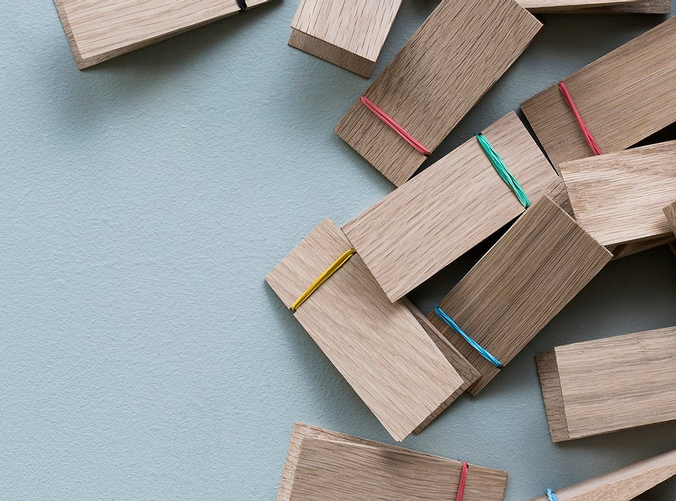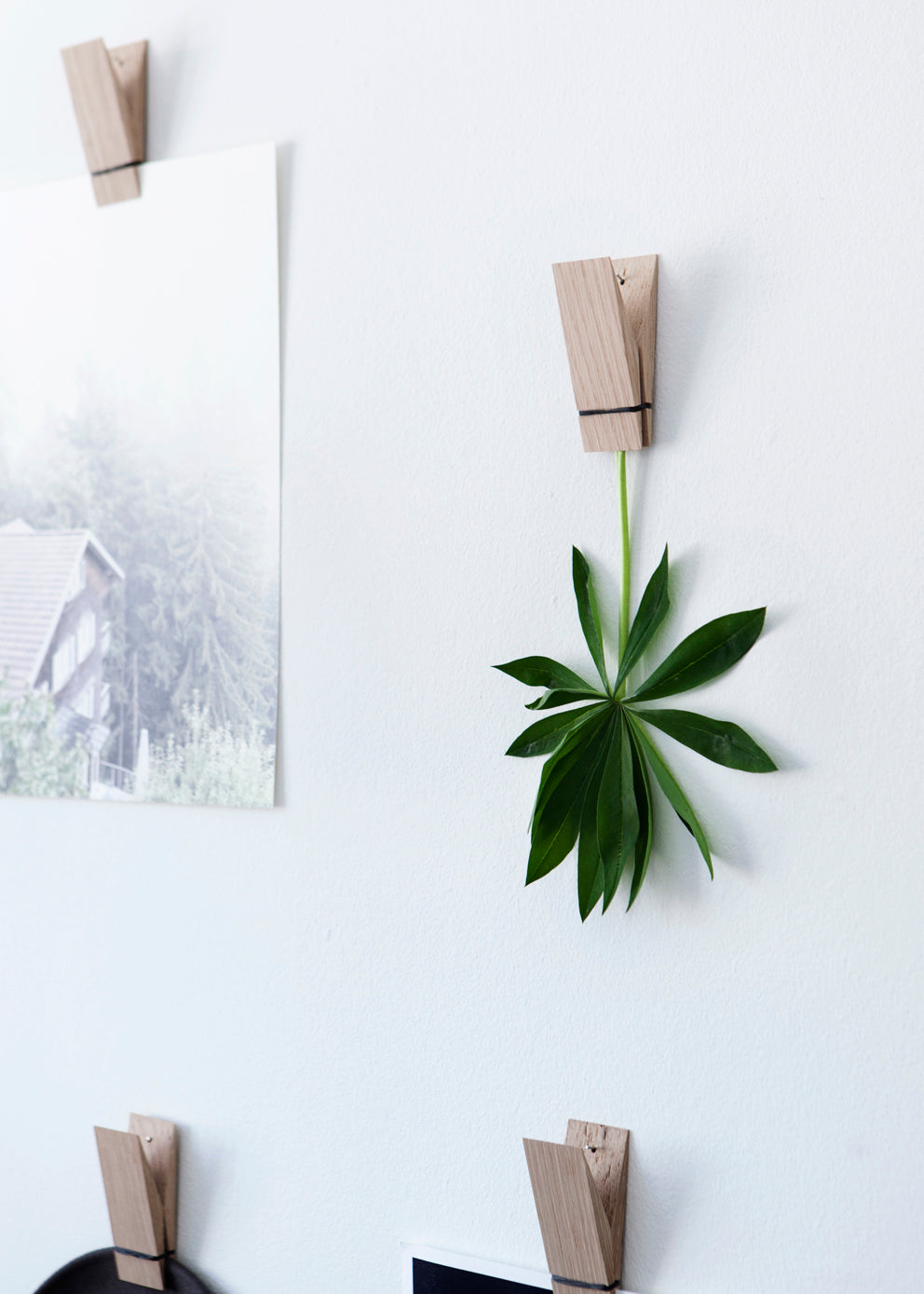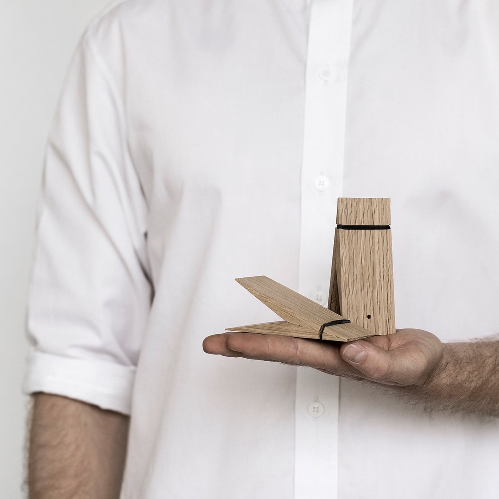 PINCH consists of two pieces of solid oak and a single rubber band.