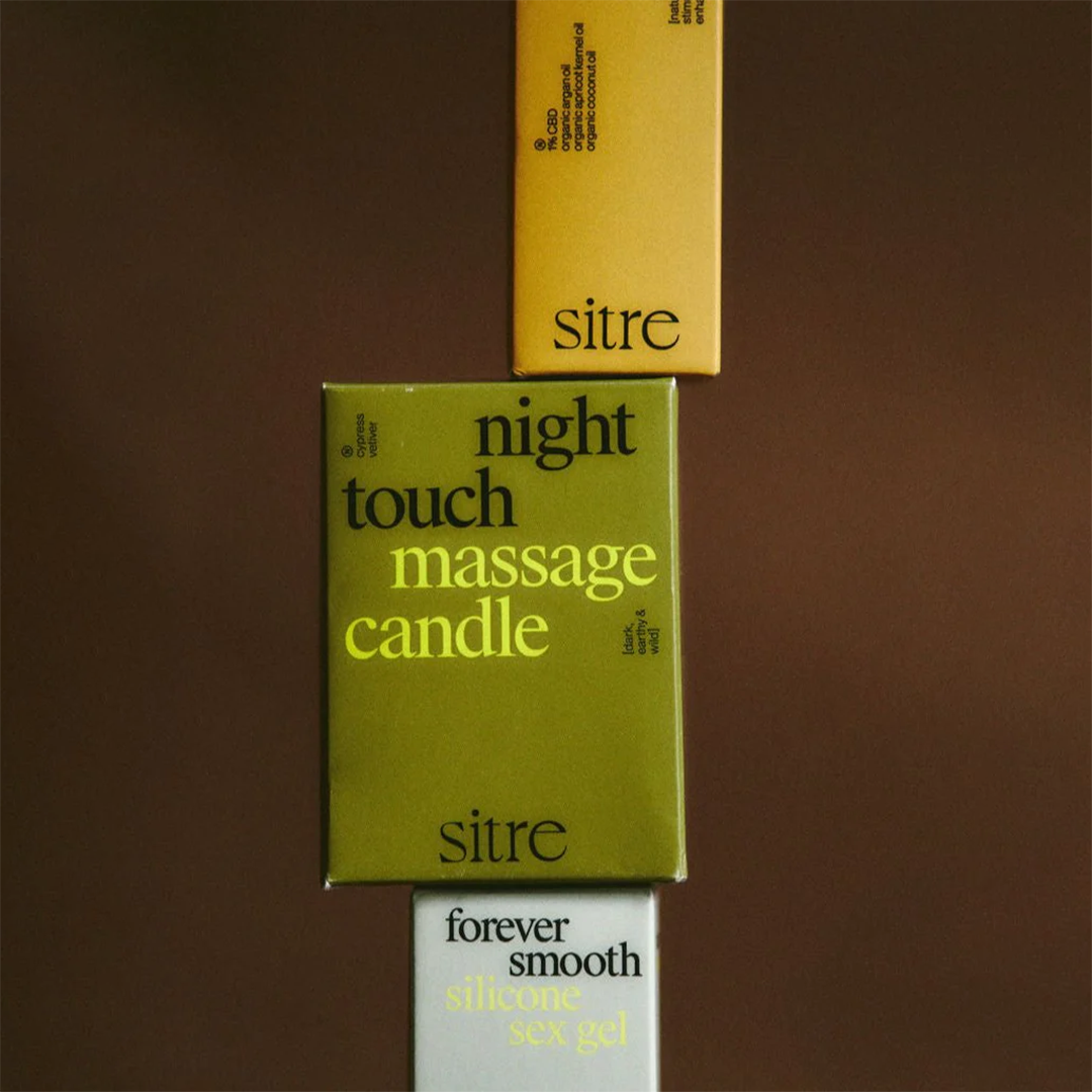 Night touch is Sitre massage candle where the wax transforms into a hot massage oil with ingredients such as jojoba oil, shea butter, and sweet almond oil.