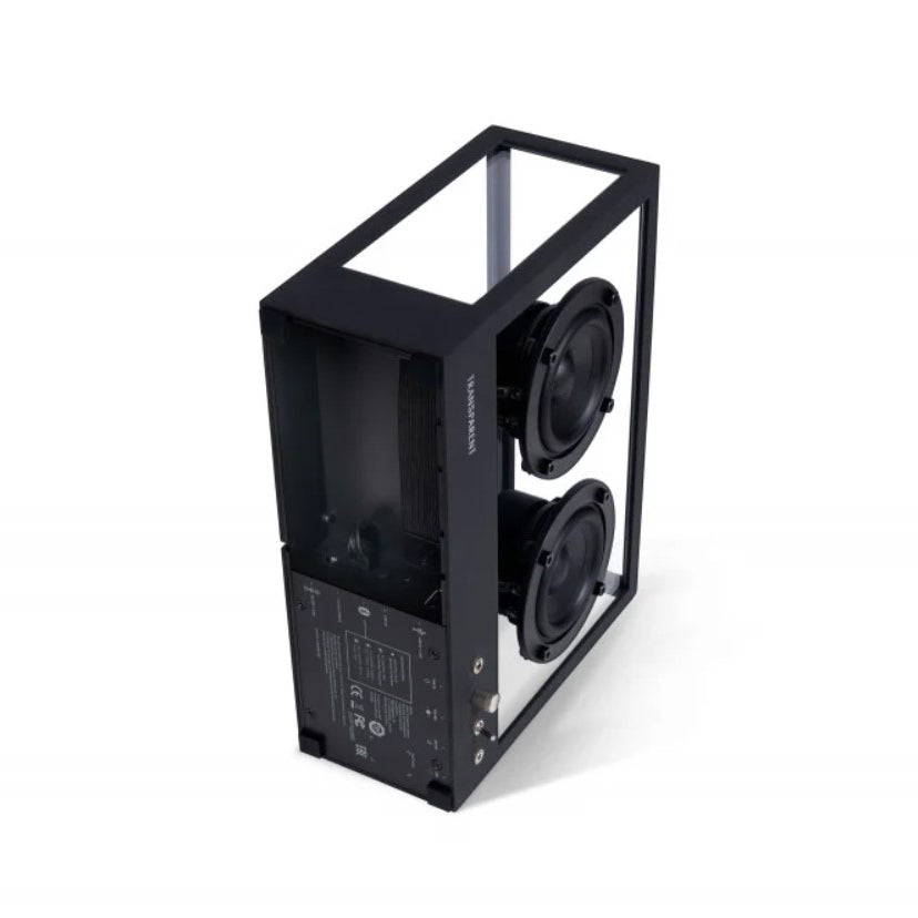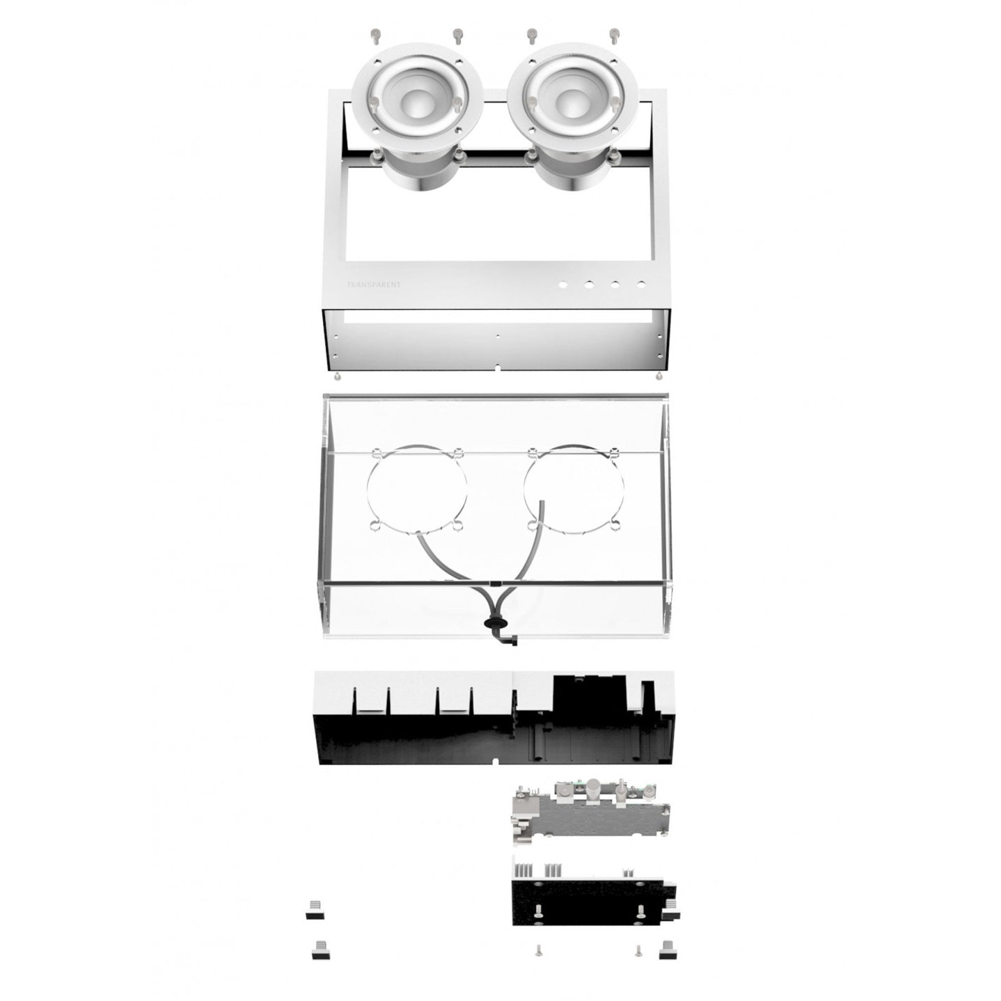 THE TRANSPARENT SOUND:"Our tightly sealed three litre enclosure and custom designed three inch drivers help to create a controlled reproduction of frequencies. We hone our powerful DSP (Digital Sound Processor chip) to ensure studio recording quality reproduction. With the Small Transparent Speaker you will hear layered reproductions of voices even if you are far away."