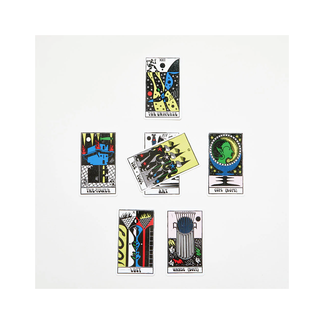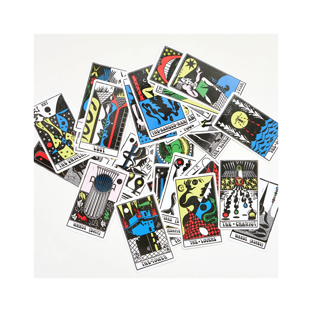 The pair have combined forces to create a 30 card linocut tarot deck, and instruction booklet, that retains an umbilical to the card's archaic roots, yet future-visions it as a glam-punk portal deep into the Now. The deck accompanies (and was born from) Keenan's experimental novella To Run Wild In It also published by Rough Trade Books.