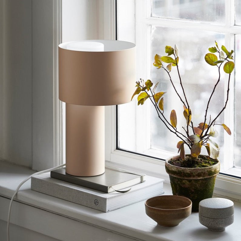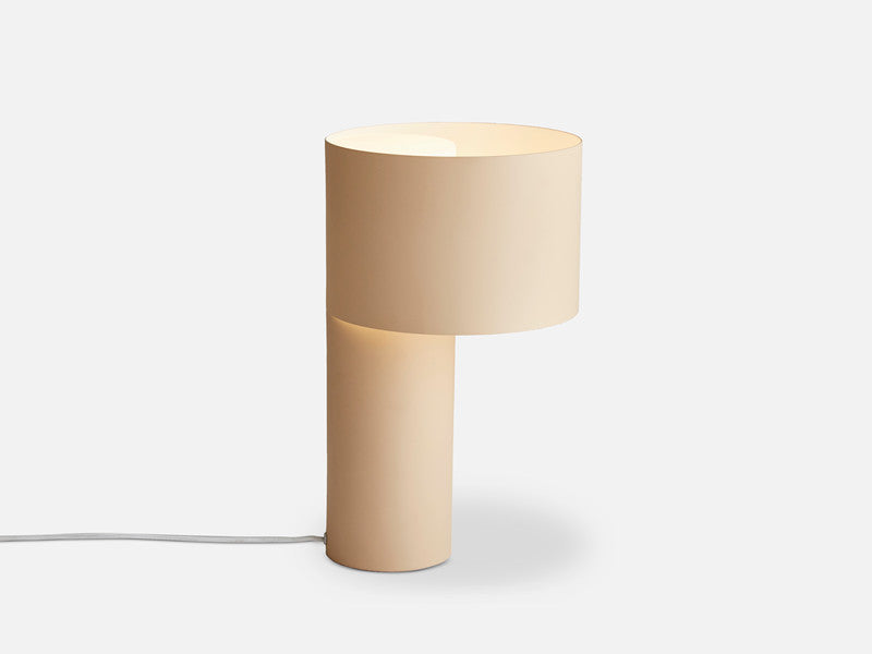 Tangent table lamp arose from an experimental study with tubes and proportion and how these can be joined together. A clean graphical design where two steel tubes meet at their tangential point of contact. The small tube provides space for the electrics while the large tube functions as the lamp shade. On top of the inner metal tube is a shade made of opal glass that covers the bulb creating a soft light when turned on and a visual effect of one cylindrical tube when turned off.
