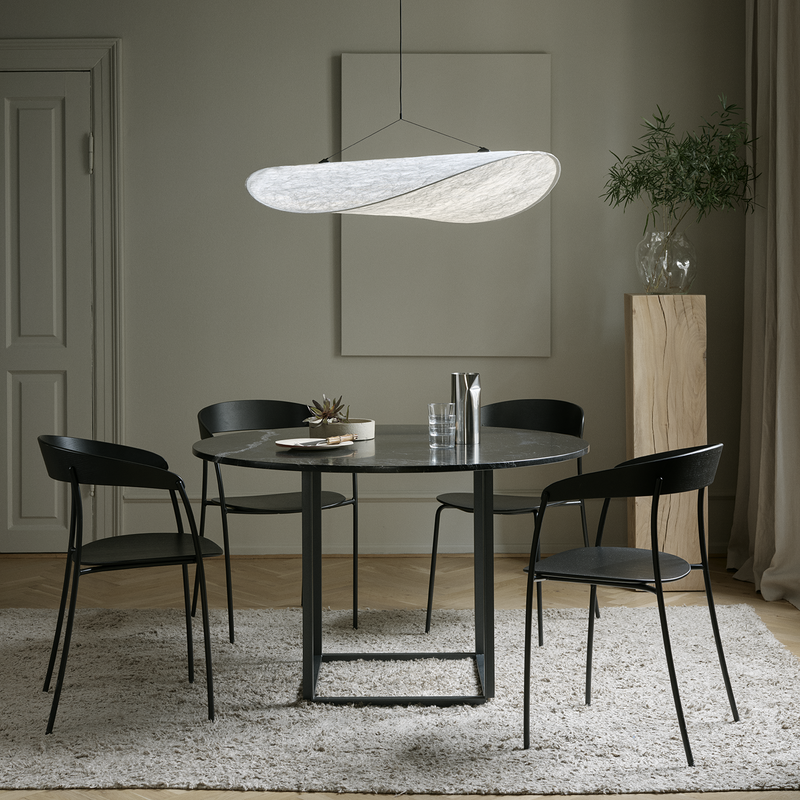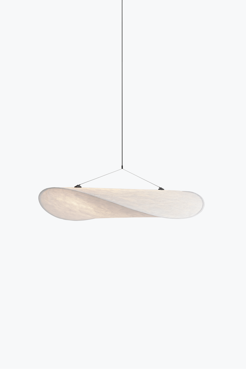 Stretching to over one metre in length, the Tense Pendant Lamp appears like a soft cloud has floated in. A truly modern construction, its soft Tyvek diffuser represents a material both durable and soft – whilst being 100% recyclable. The flexibility of this paper-like diffuser allows its slim frame to accentuate the cloud like qualities of the Tense Pendant Lamp. Finished with a slimline LED light source, all components fit into a slim box for ease of transport. A truly modern approach to lighting.
