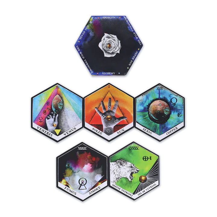 Sitting within a beautiful keepsake box lies a 236 page hand-lettered, fully illustrated guidebook that demystifies the esoteric world of Alchemy, and 71 easy-to-shuffle hexagon cards divided into six suits: The Cosmic Forces, The Colors, The Seasons, The Materials, The Mysteries, and The Operations. Designed and illustrated in Krans’ iconic style of exquisite line art and lush watercolor painting, each card offers a tool for self-study and exploration, such as Saturn, a reminder to examine age-old systems and the Mystical Sister card that brings to mind a resource or ally on our journey. Through observing the symbols and images from the alchemical perspective, we awaken our gifts, engage with the creative mystery of our everyday world, and unite the materials of the soul.