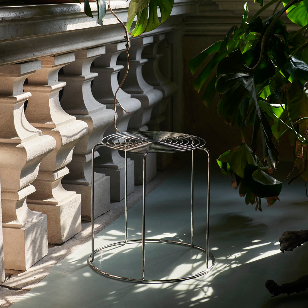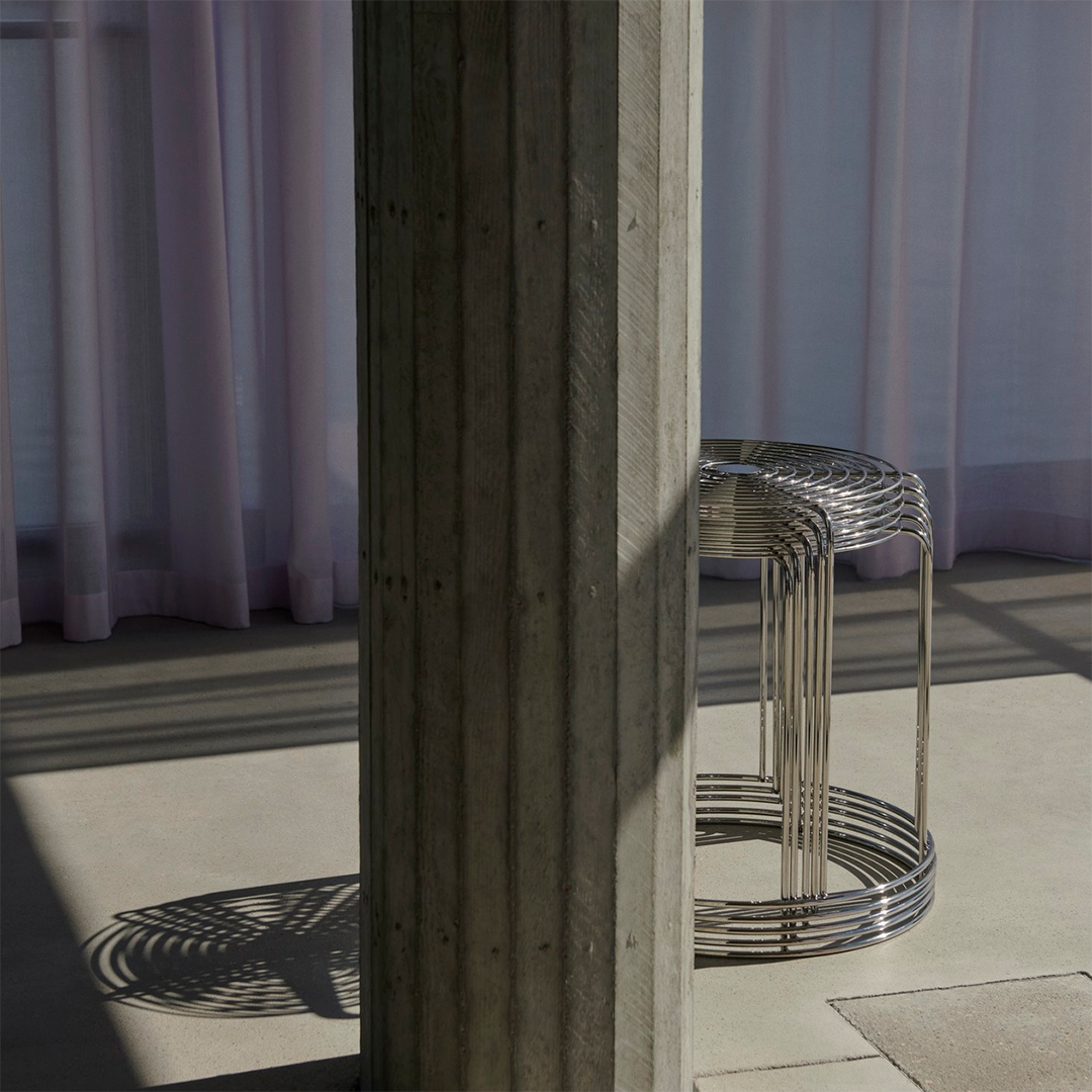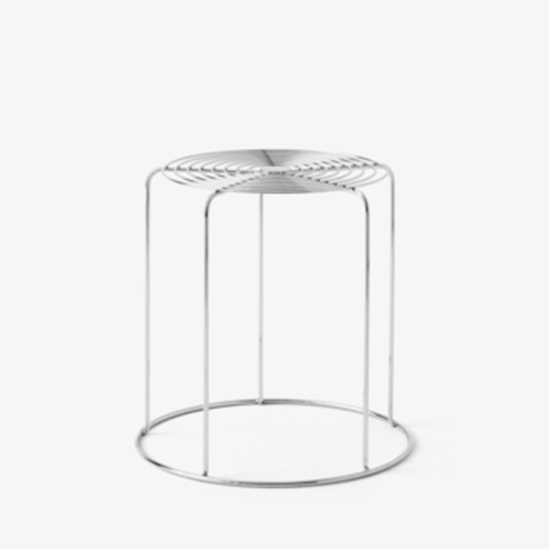 What makes the Wire Stool indicatively Verner Panton is the use of stainless-steel wire to create a simple geometric shape with repeated patterns, in a stackable stool that doubles as a side table.