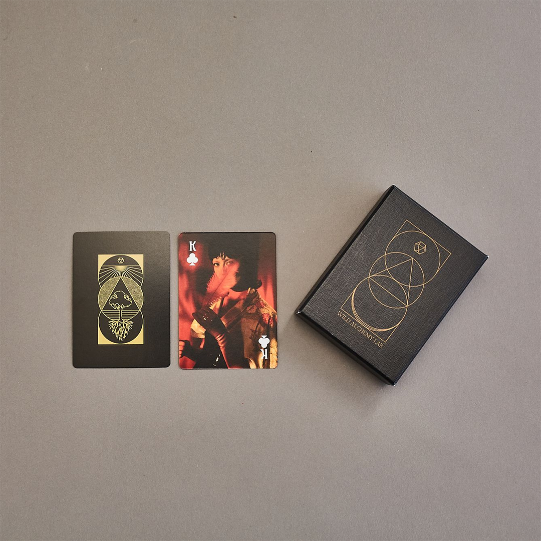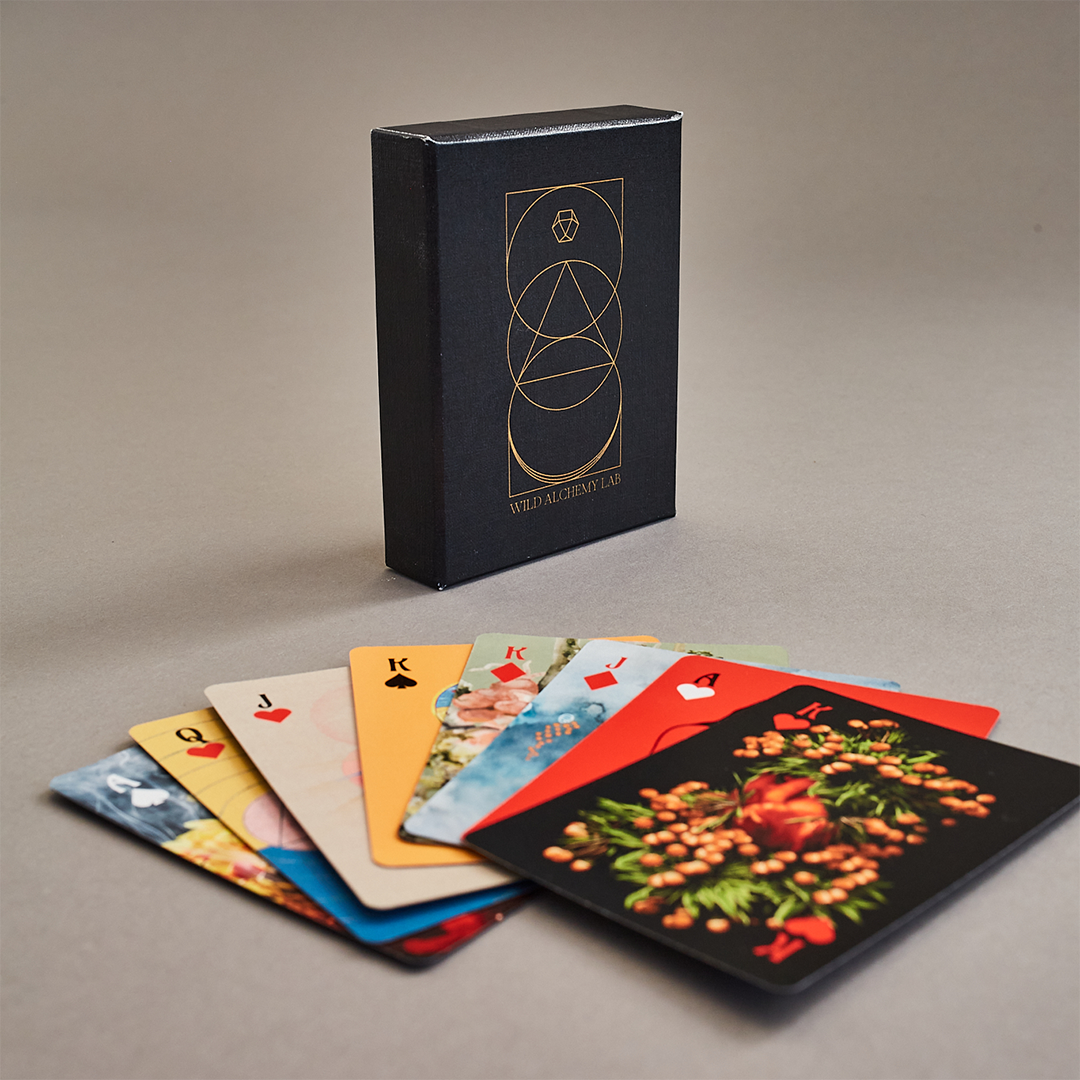Playing card deck of 52 poker cards and two jokers featuring artwork from the Earth and Fire editions of the Wild Alchemy Journal. The queen, king and ace of each suit is a portal to films, meditations and soundscapes that can be accessed by scanning the card with the free augmented-reality mobile app Artivive.