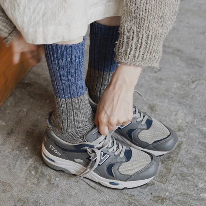 Wool and cotton are gently intertwined to create these wool-cotton socks. The vintage look and comfort maximizes with wear. These rib-patterned socks are created with wool and cotton that are gently twisted into slab style weaving. This type of weaving gives these socks a casual look and the gently intertwined yarn envelops your feet with softness and warmth. The vintage look and comfort maximizes with wear. Wool and cotton absorb the dye at different time frames. We like the variance of tones created by the dyeing process as it adds to this casual and playful look.