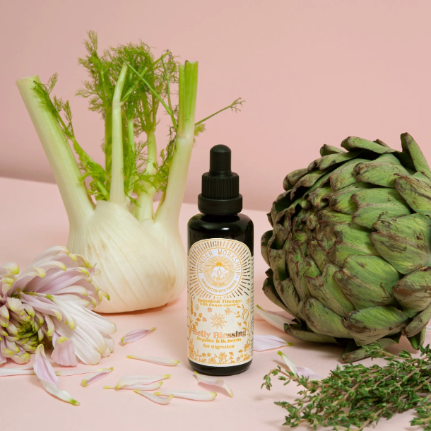 A unique alchemy of digestive herbs thyme, burdock, dandelion, fennel, artichoke and peppermint, purposefully blended with cerato flower essence for healthy digestion, a blessing for your belly.