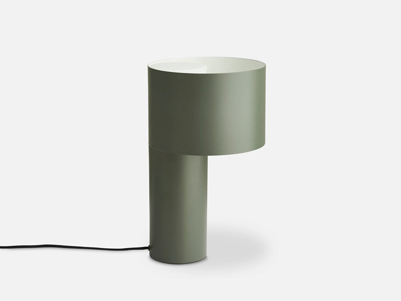 Tangent table lamp arose from an experimental study with tubes and proportion and how these can be joined together. A clean graphical design where two steel tubes meet at their tangential point of contact. The small tube provides space for the electrics while the large tube functions as the lamp shade. On top of the inner metal tube is a shade made of opal glass that covers the bulb creating a soft light when turned on and a visual effect of one cylindrical tube when turned off.
